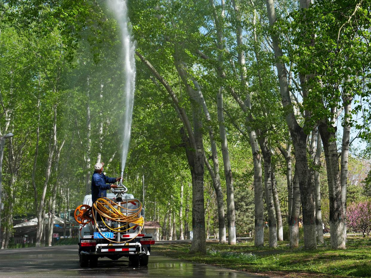 短期治理以快速抑制飞絮飘散为重点,湿化是最直接有效的手段。一方面对树冠定时喷水,增大树干整体湿度,从源头减少飞絮;另一方面对已飘落地面的飞絮,先洒水湿化再集中清扫,避免二次扬起。