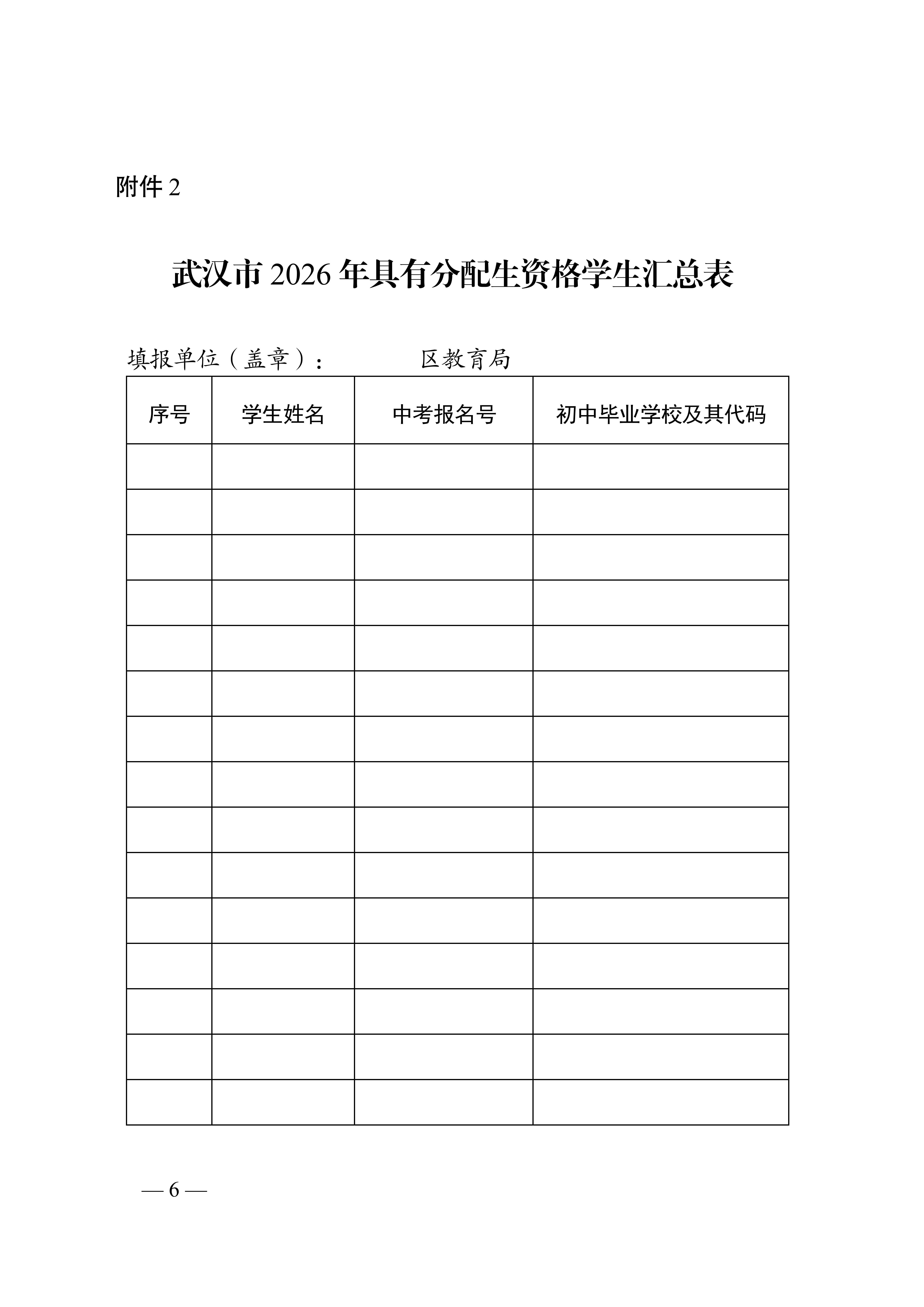 2.各区审定、上传。4月24日前,各初中学校将公示无异议的具有分配生资格学生名单报区教育局。区教育局审定后,汇总名单于4月25日前上传武汉市中招综合管理平台(网址:zkzz.whzkb.cn),同时将《武汉市2026年具有分配生资格学生汇总表》(纸质盖章版和Excel格式电子稿)报市教育局基础教育处。