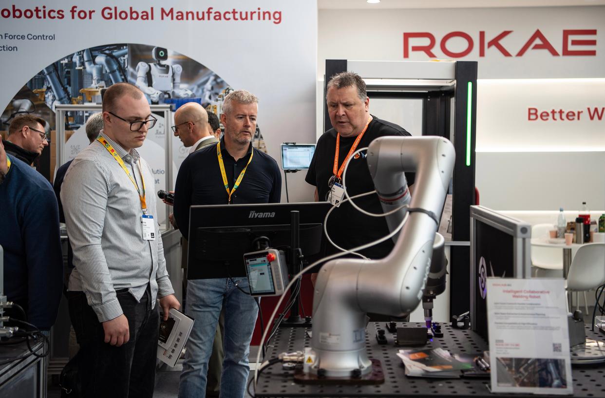 4月21日,人们在德国汉诺威工业博览会珞石展台交流。新华社记者 张豪夫 摄