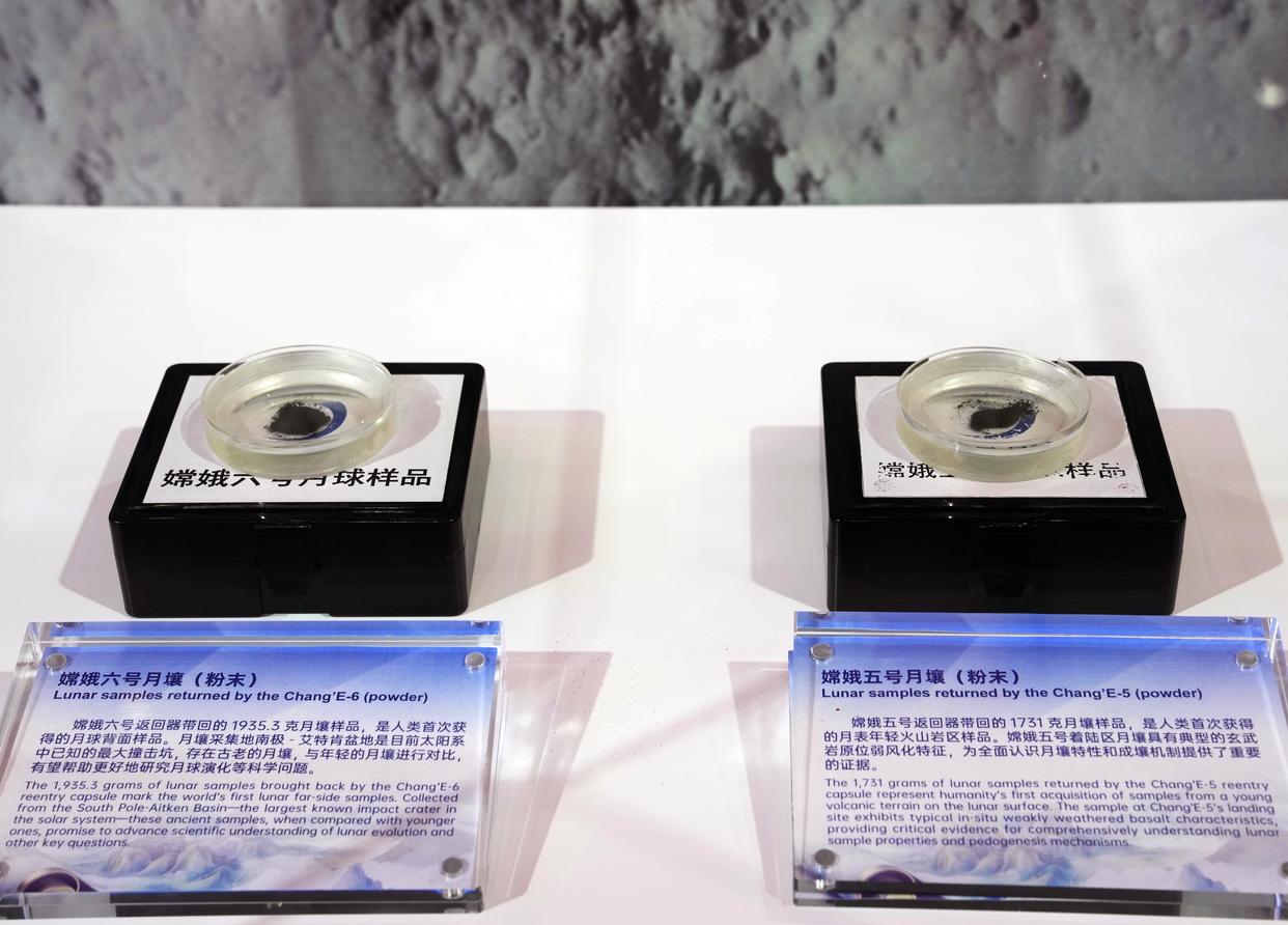 这是2025年11月5日在第八届进博会国家展中国馆拍摄的嫦娥五号月壤和嫦娥六号月壤。新华社记者 刘颖 摄