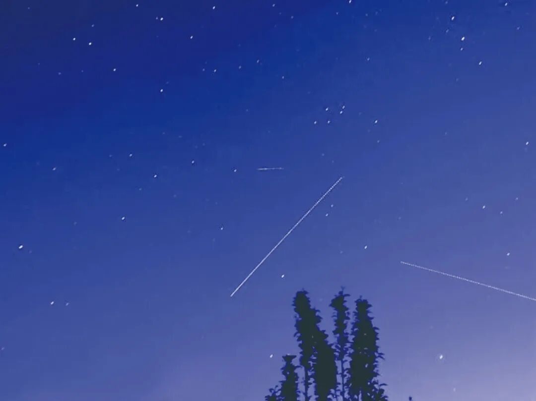 2022年4月22日,“东方红一号”卫星(图片正中位置的短线)与中国空间站(从右上至左下的斜长线)同框。朱进/摄。来源:中国科学报
