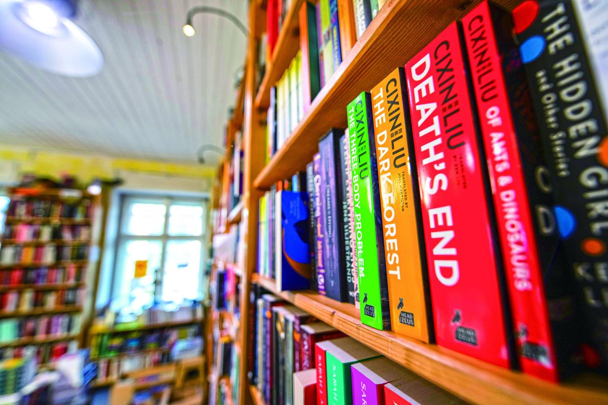 4月16日在柏林异境书店内拍摄的中国科幻作家刘慈欣的作品。这家书店被刘慈欣比喻为“不灭的灯塔”。新华社记者张豪夫摄