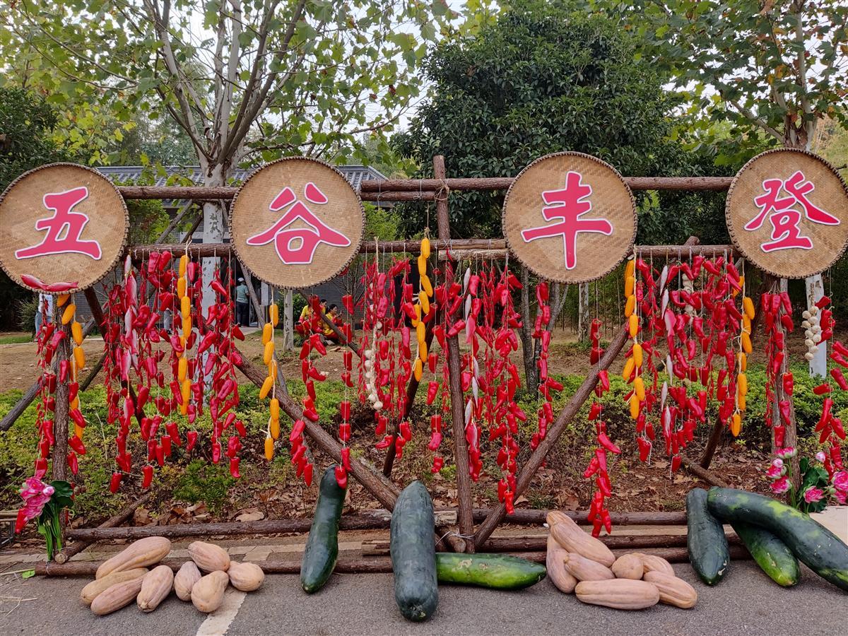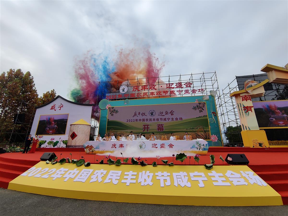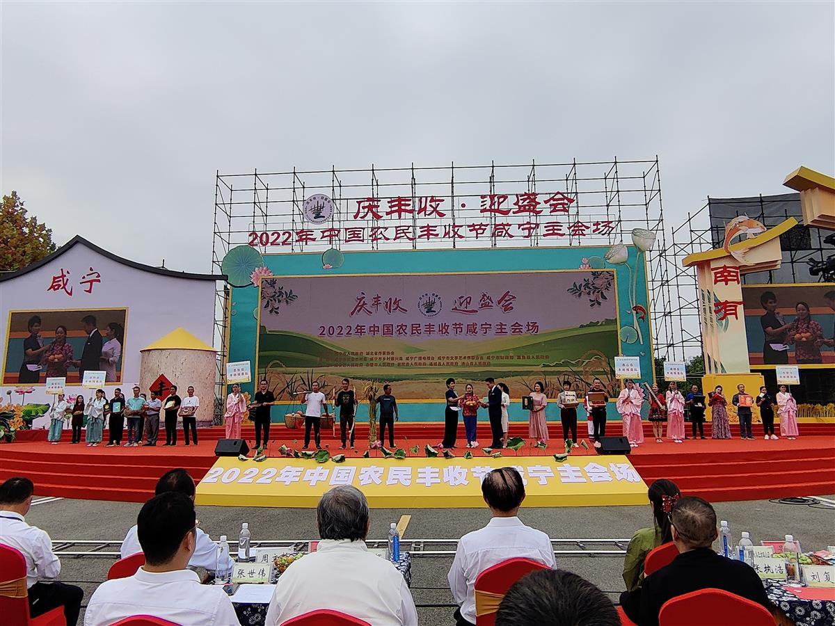 9月23日,农历秋分,湖北省咸宁市嘉鱼县官桥八组田野乡村公园里传来礼赞丰收的阵阵欢歌,“庆丰收·迎盛会”2022年中国农民丰收节咸宁主会场活动在这里举行。来自咸宁市六个县市区的乡亲代表展示了特色农产品带来的丰收喜讯,其中嘉鱼县代表队展示了新鲜的南瓜与野藕、香辣爽口的清江鱼等产品,一人高的巨型稻最引人注目。