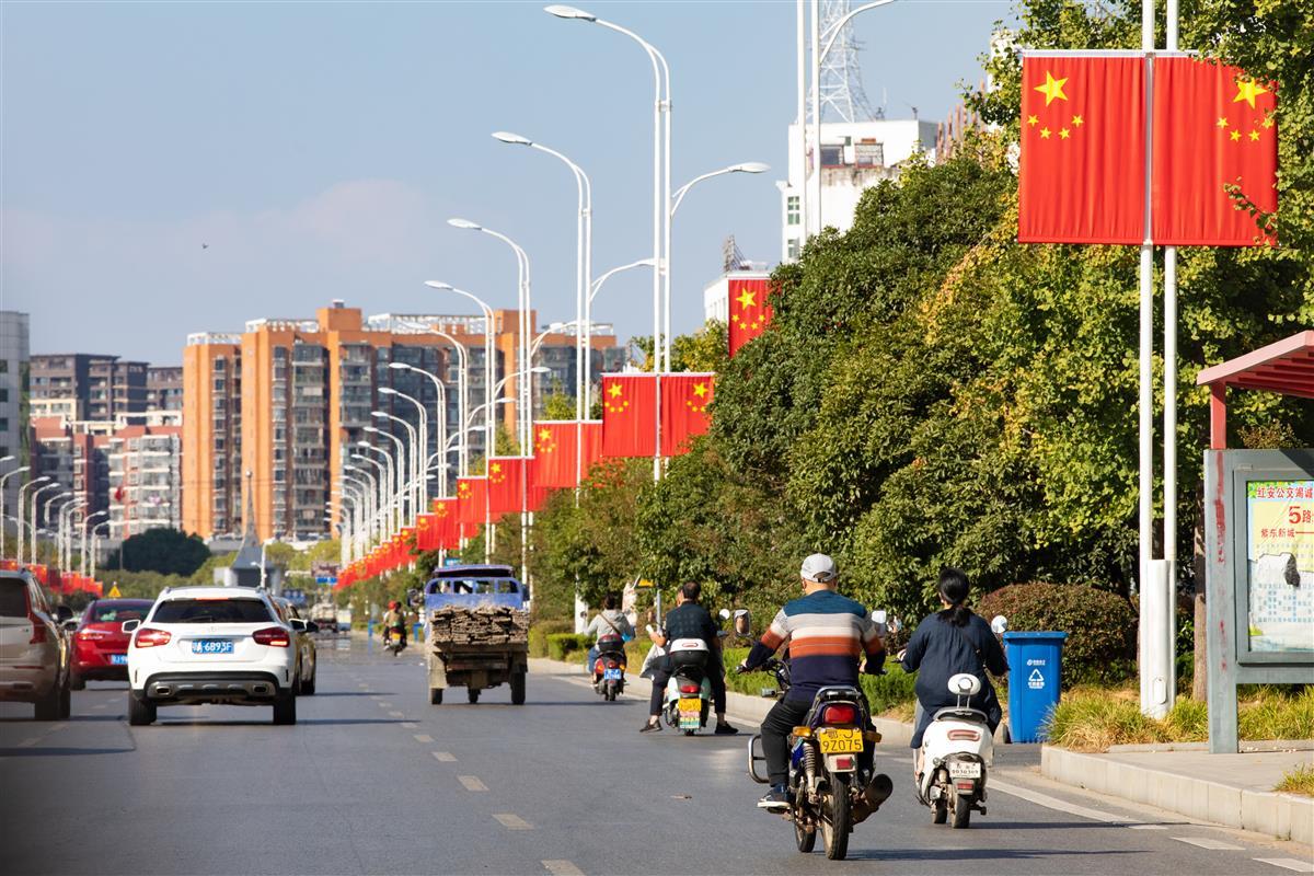 在红安二桥,鲜艳的国旗挂满路灯灯柱,庄重喜庆。