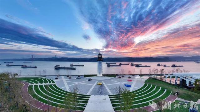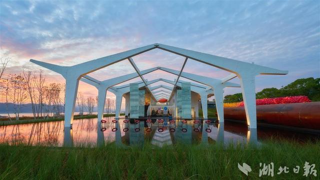 穿越其中,一处红黄相间的大型艺术品映入眼帘,作品是用上千个大型水产养殖漂流瓶制作而成,用艺术设计致敬长江渔民。
