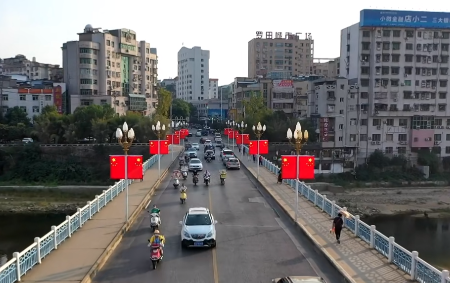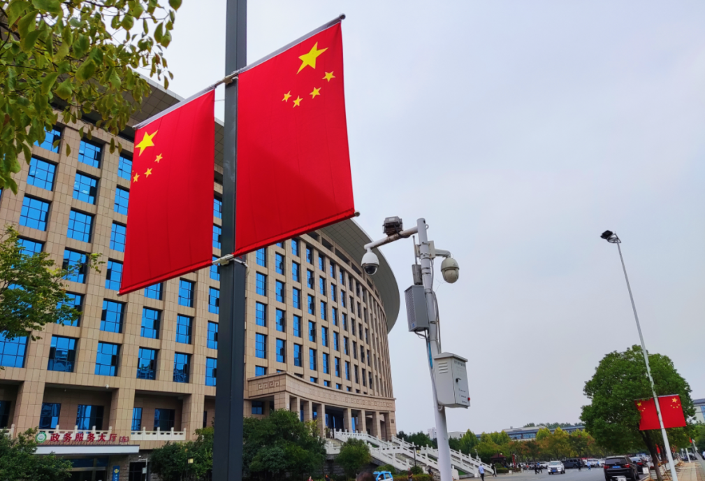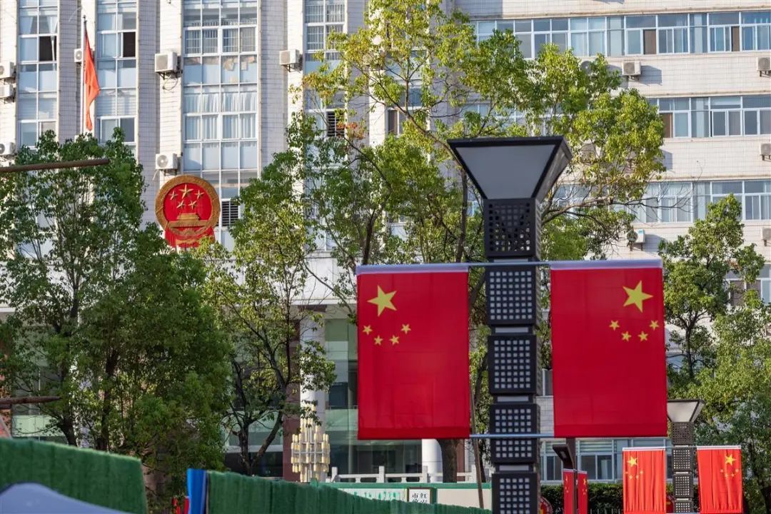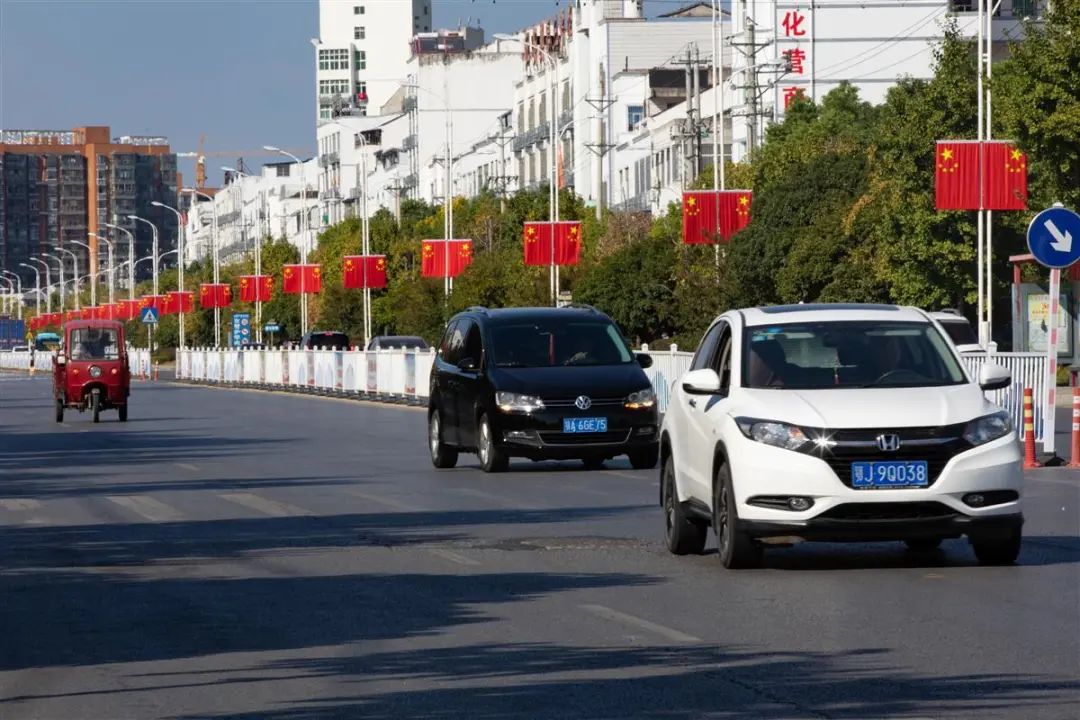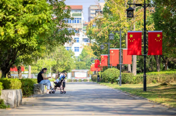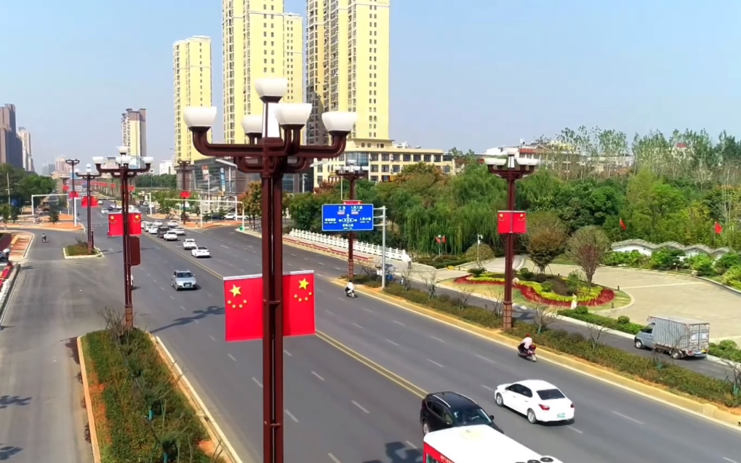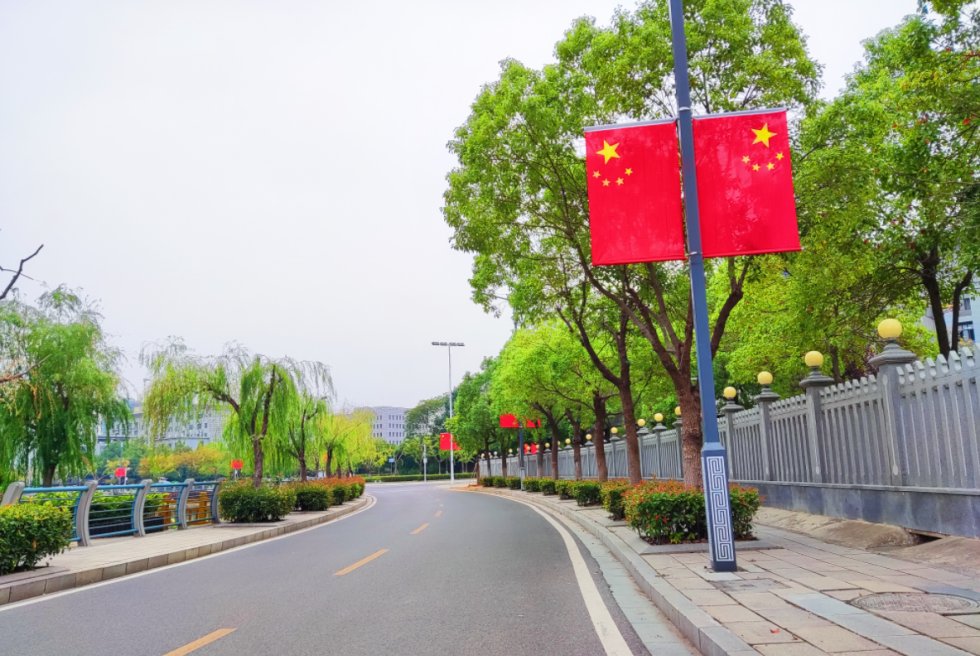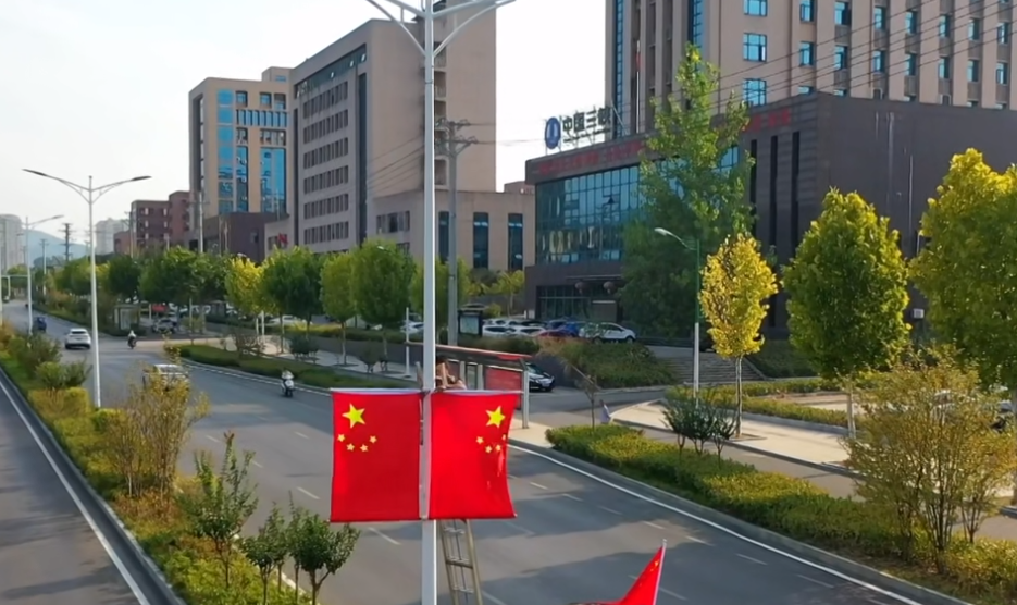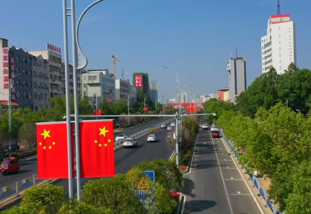 罗田县主次干道、重要交通节点上的路灯杆上悬挂鲜艳的红旗,处处呈现出欢乐祥和的浓厚节日氛围,进一步增强了人们的爱国热情和民族自豪感。