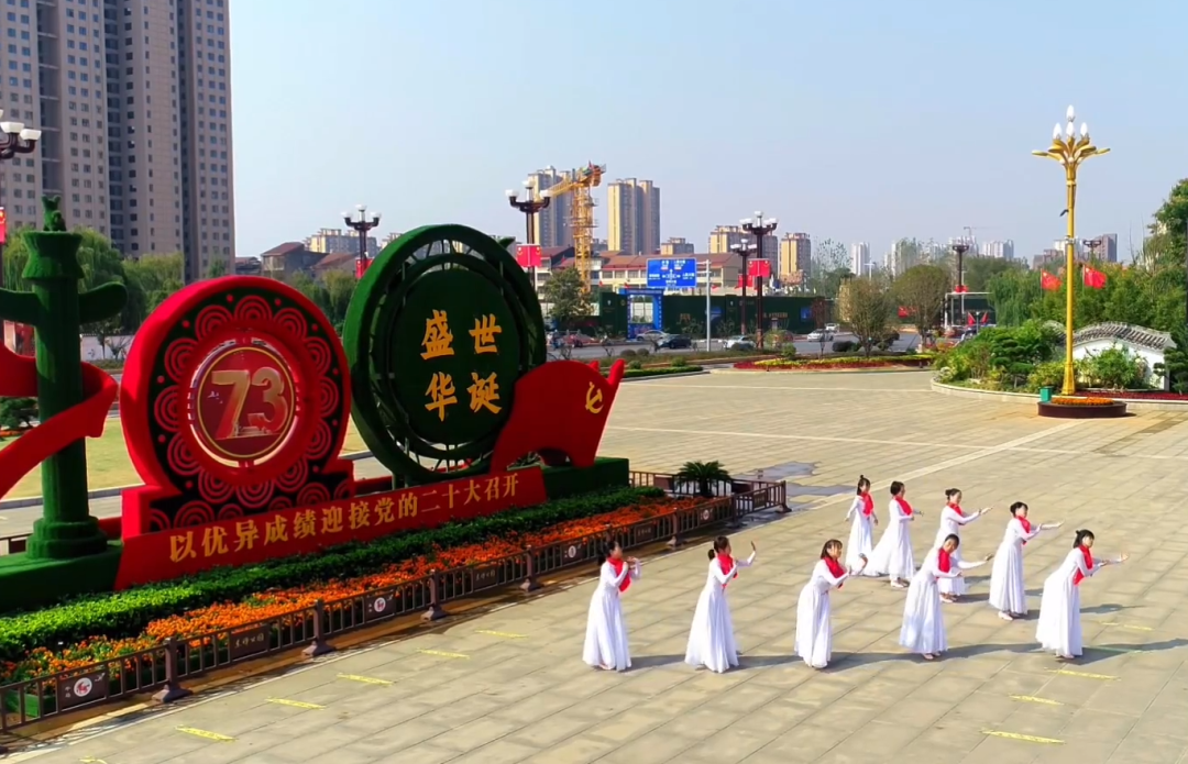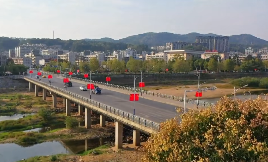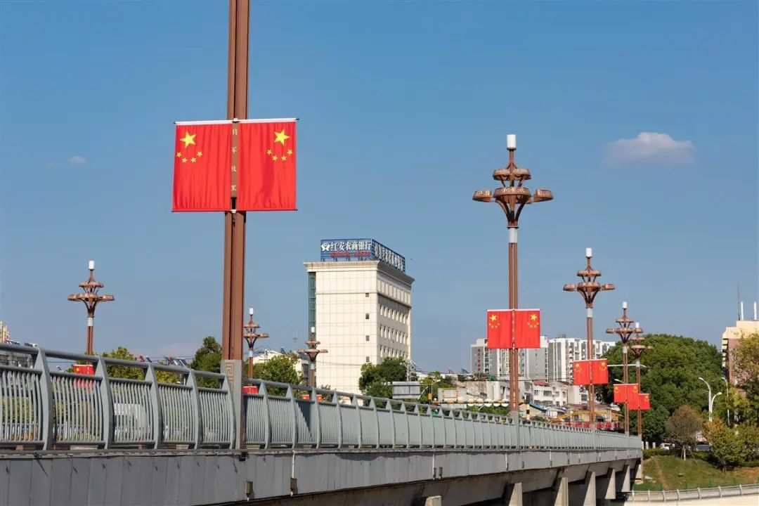 在中国第一将军县——红安县大街小巷,国旗迎风飘扬。这座红色小城的人们,正用满城的中国红表达对新中国最真挚的祝福。