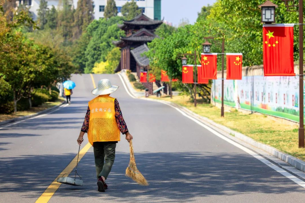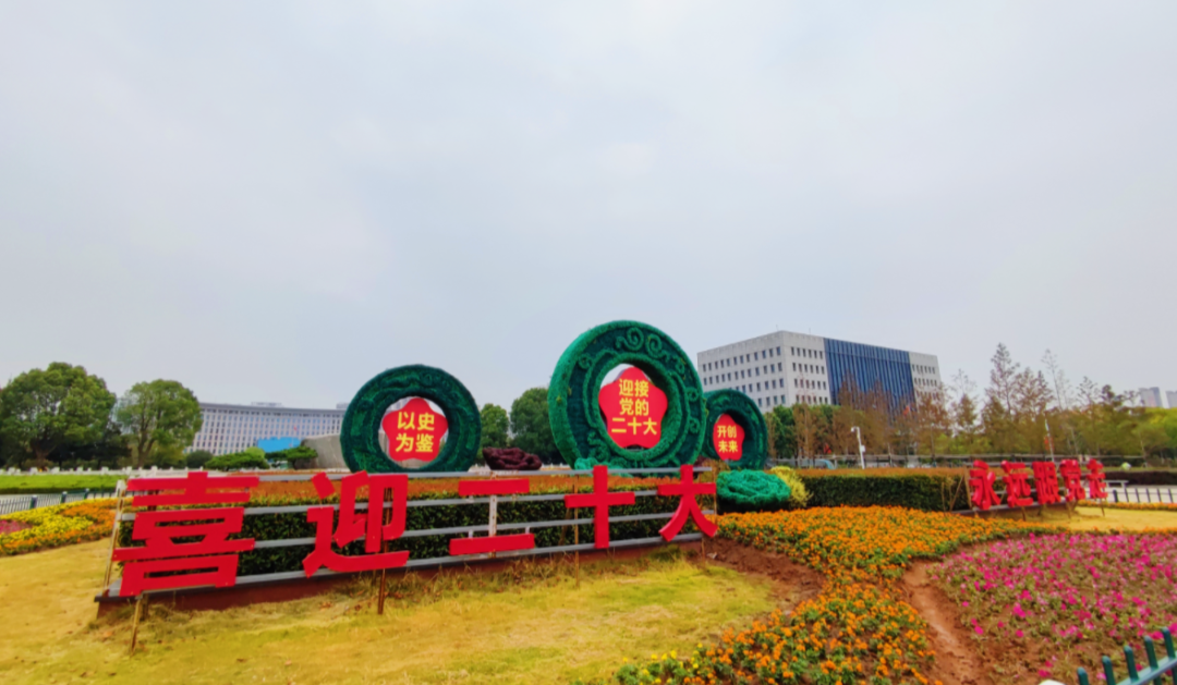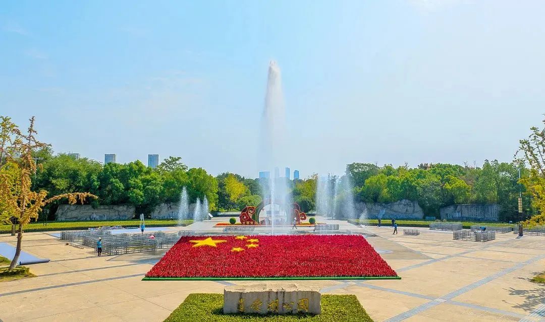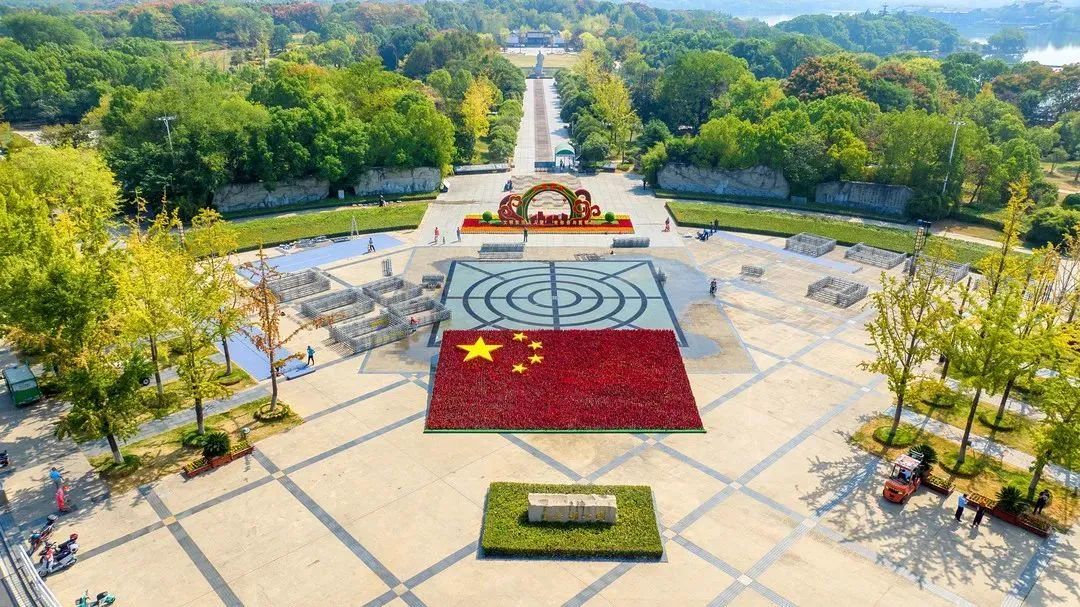 在遗爱清风景区门口,你会发现近2万盆红叶凤尾拼成了五星红旗纹样,占地216平方米,在广场上铺开,准备工作紧锣密鼓,献礼祖国诚意满满。
