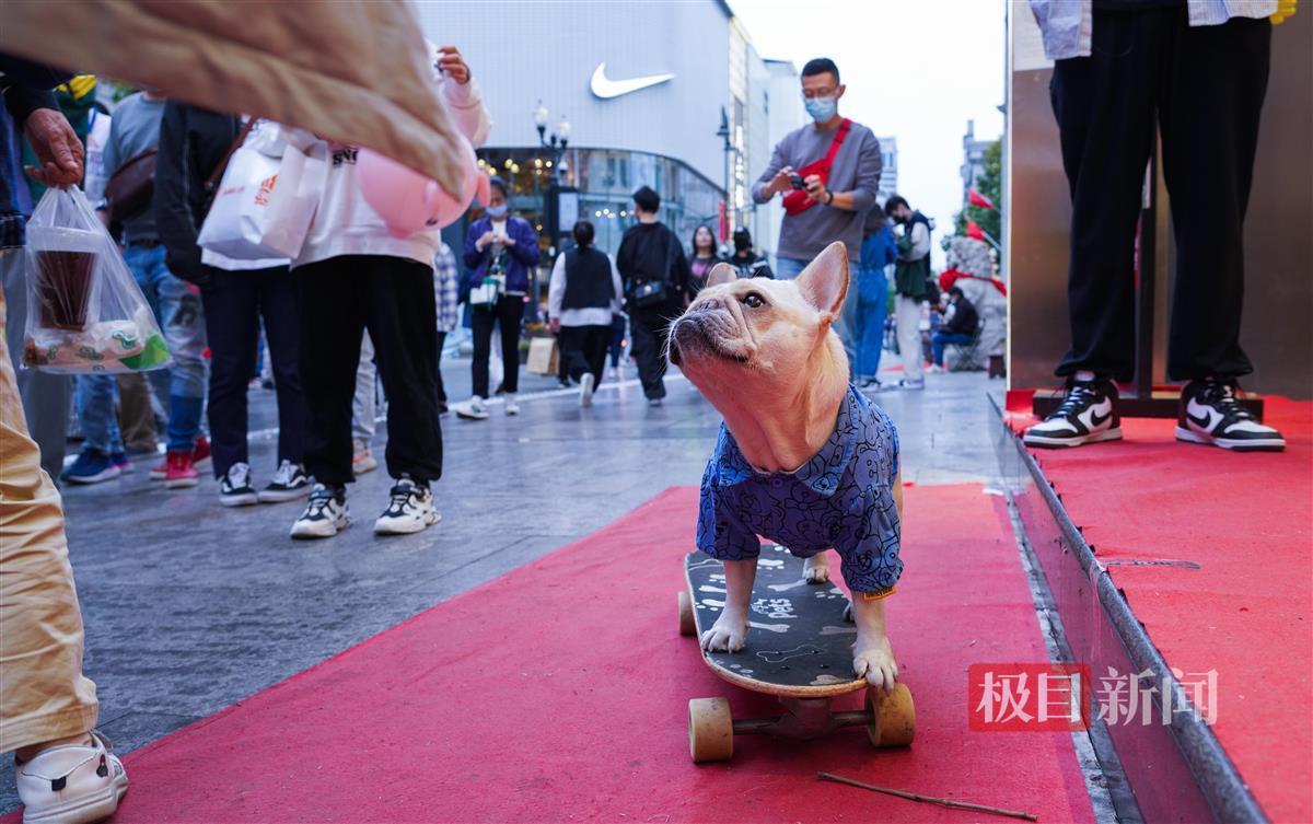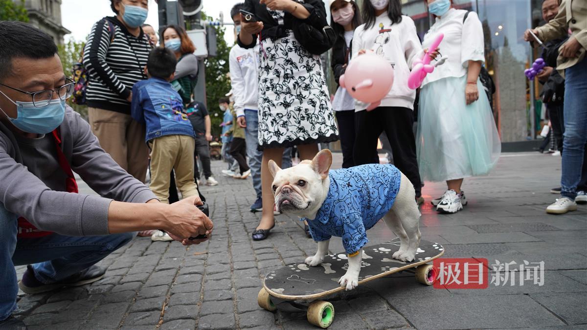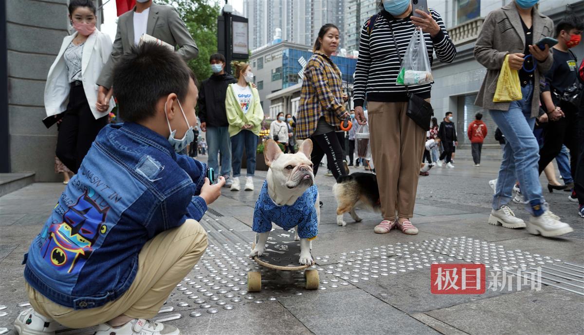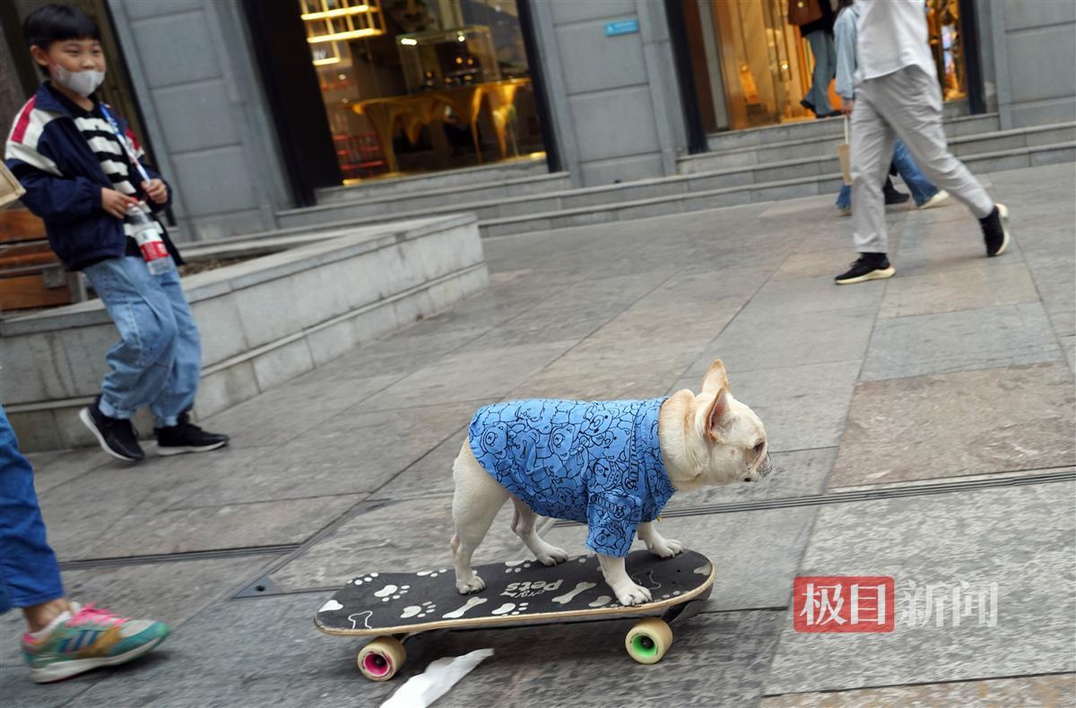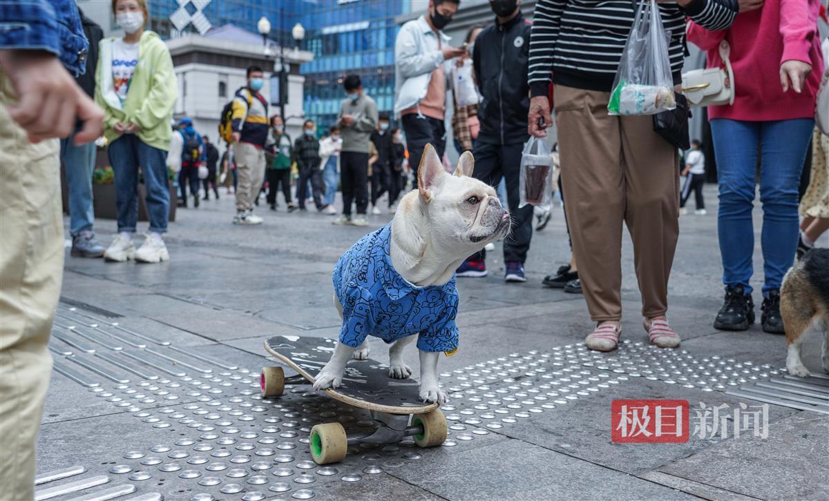 10月4日,一只打扮比较时尚的小法斗狗踏着滑板,逛起了汉口江汉路,引来不少市民游客好奇的目光,人群中,有人惊呼“‘球球’来玩滑板了”。现场有不少人认识它。