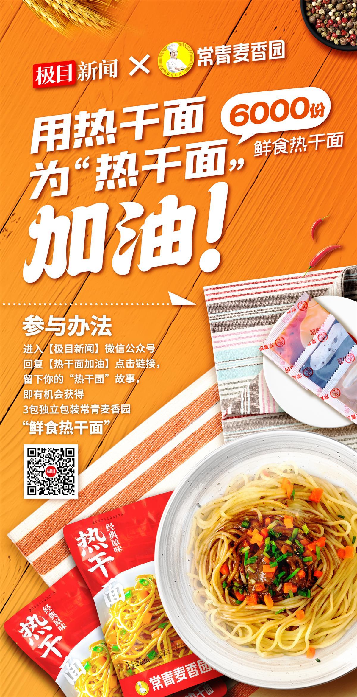 11月7日,极目新闻联合常青麦香园联合推出“用热干面为‘热干面’加油!”公益活动,向社会各界送出6000份独立包装常青麦香园“鲜食热干面”。