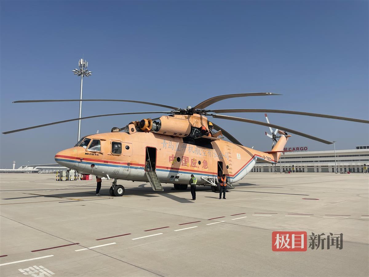 极目新闻记者看到,米—26直升机外观涂满了黄色喷漆,“中国应急”四个喷绘的大字赫然醒目,除此以外,机身还标注着“青岛直升机航空有限公司”。据介绍,该直升机由8片弦长桨叶组成,值得一提的是,该直升机旋翼叶片的数量也是世界上直升机旋翼叶片里最多的。