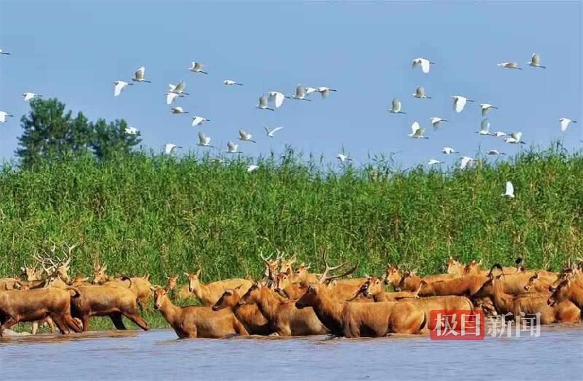 石首麋鹿国家级自然保护区,麋鹿从最初引进的64头繁衍壮大至2500余头,全部实现自然繁衍。