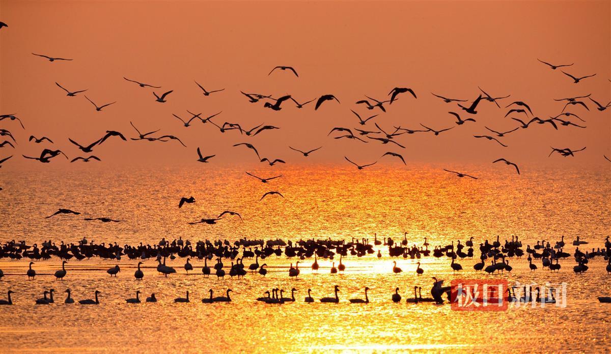 湖北龙感湖国家级自然保护区内,小天鹅沉醉夕阳中