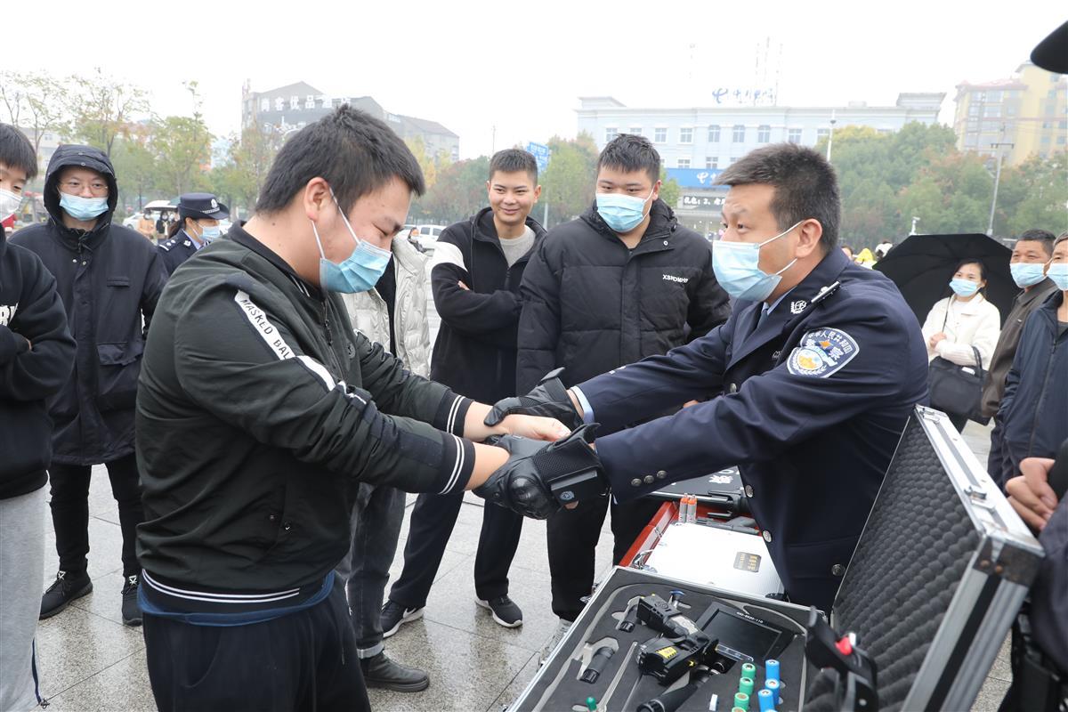 群众一件一件地看,民警在一旁认真详细介绍武器装备的名称、用途和使用方法,并不时让群众在民警的指导下进行武器使用体验。