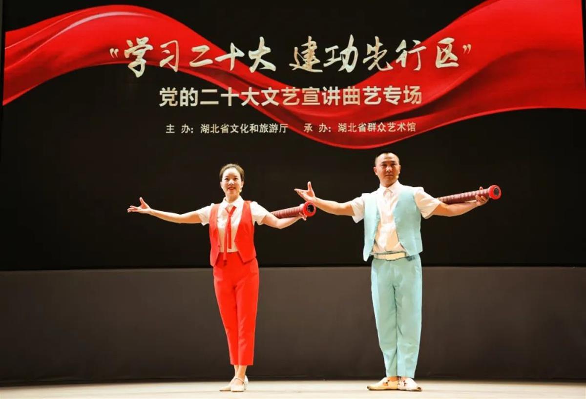 湖北省群众艺术馆介绍,“学习二十大 建功先行区”党的二十大理论宣讲曲艺专场活动旨在深入学习宣传贯彻党的二十大精神,用鲜活生动的曲艺形式把二十大精神讲出来、唱出来、演出来,把二十大精神“讲”到老百姓的心坎里,涵盖了快板书、湖北小曲、恩施扬琴、湖北大鼓、天门渔鼓、宜昌南曲六种曲艺说唱形式,表演者中不仅有国家级非物质文化遗产传承人,也有青年曲艺干部。“全省群文曲艺工作者表示,要当好文艺轻骑兵,继续深入生活,扎根人民,积极创演更多让人民满意的优秀作品,努力践行‘曲随时代,艺为人民’。”