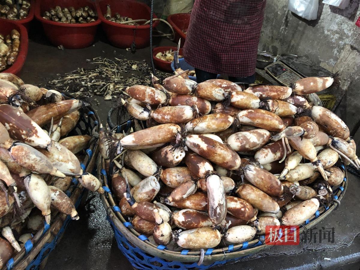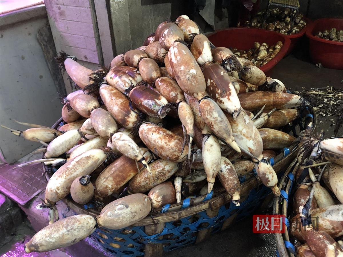 在相距不远的另外一家卖藕的门面前,带着泥巴的莲藕按大小装在不同的竹框里,价签牌上同样写着“包粉”两个字。老板称,今年从田里拖回来的莲藕基本都是粉藕:“包粉,卖了这么久,没有说不粉的,去了皮都是粉中带白的颜色,说明肯定是合格的。”