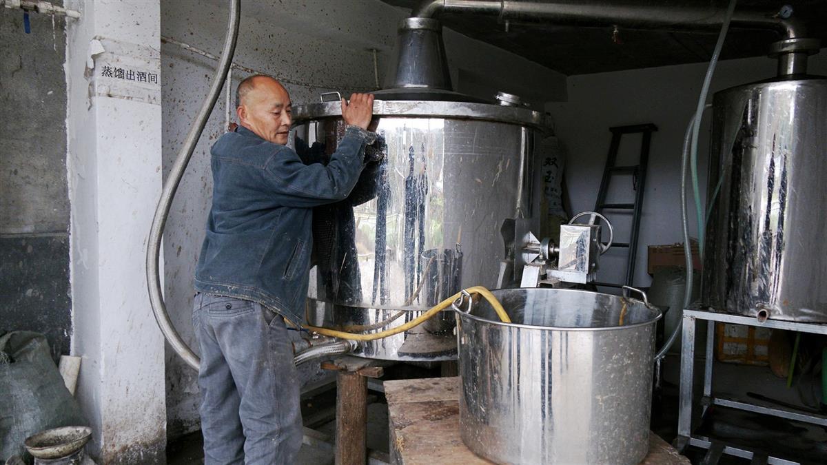 眼下虽然天气寒冷,但在邵传华的酒坊里却是一片热气腾腾。只见他用力地挥动着铁锹从发酵缸里铲出发酵酒后,再次均匀进行搅拌并放入蒸馏桶里。在燃烧的熊熊大火中,一股带着浓浓桂花香味的白酒从酒槽中缓缓流出,“今年天气干旱,本地鲜桂花采摘不到,只能从外地购买干桂花,酿酒的时间也只好推迟。要在以前,十月桂花飘香时就开始酿酒了。”邵传华边笑着解释边用仪器测量着酒精度数,“只能留取50度以上的酒进行封坛储藏,年份越久,桂花酒就越醇香可口。”