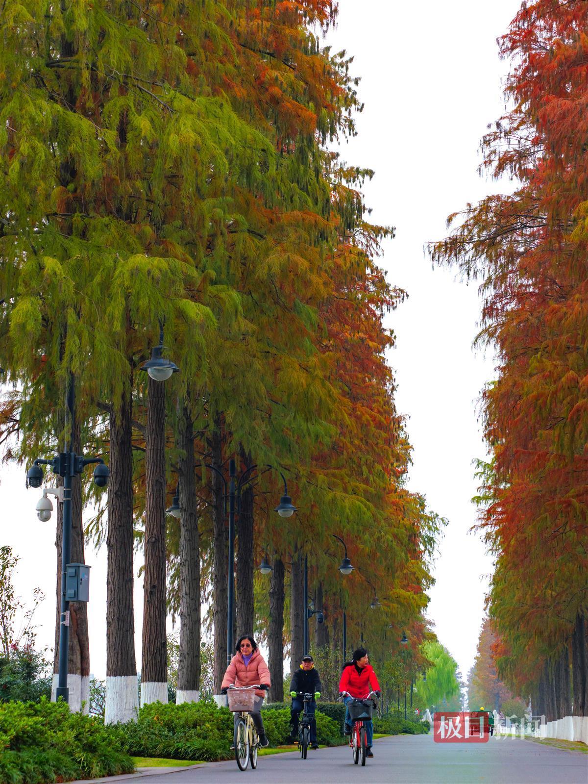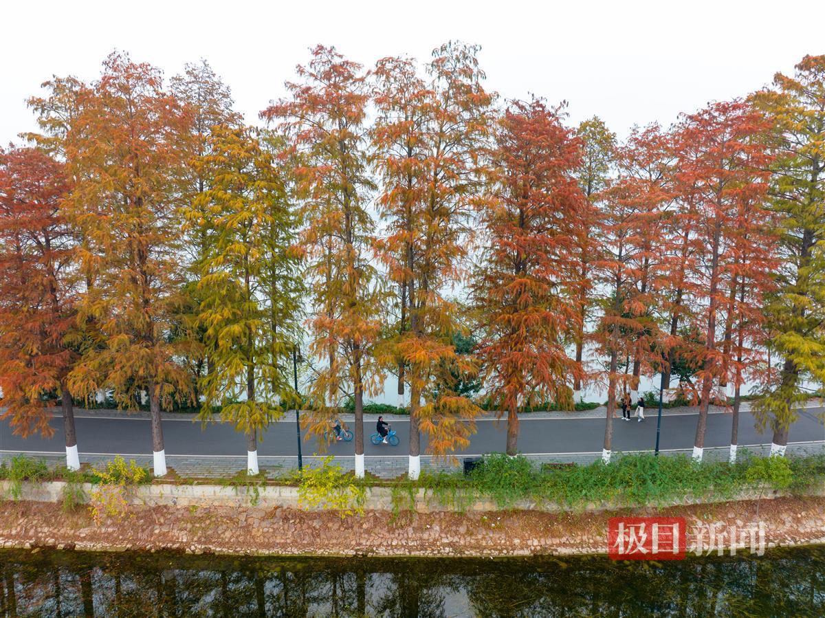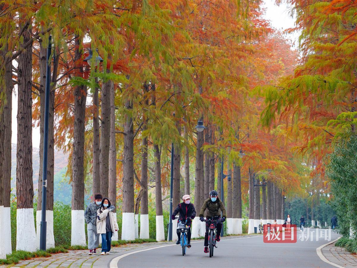 12月8日,武汉东湖,绿道两旁的水杉树叶逐渐由绿转红,披上“红装”。游客徜徉林下,犹如在水彩画卷中漫步。