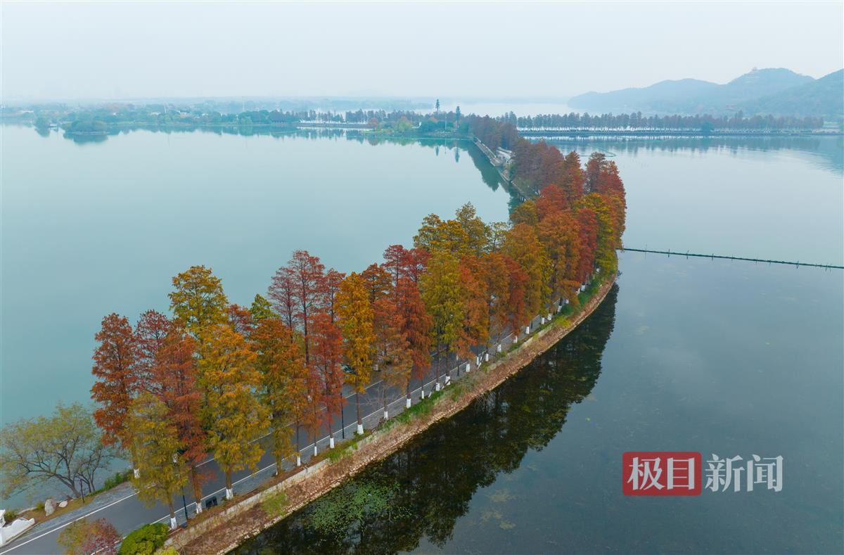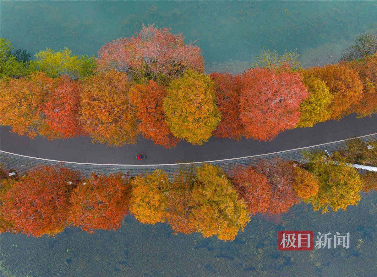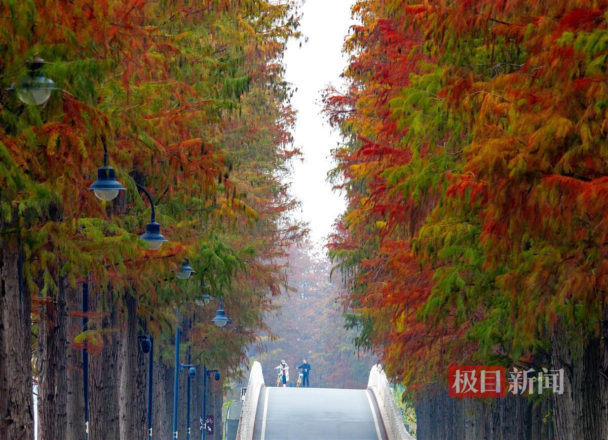 12月8日,武汉东湖,绿道两旁的水杉树叶逐渐由绿转红,披上“红装”。游客徜徉林下,犹如在水彩画卷中漫步。