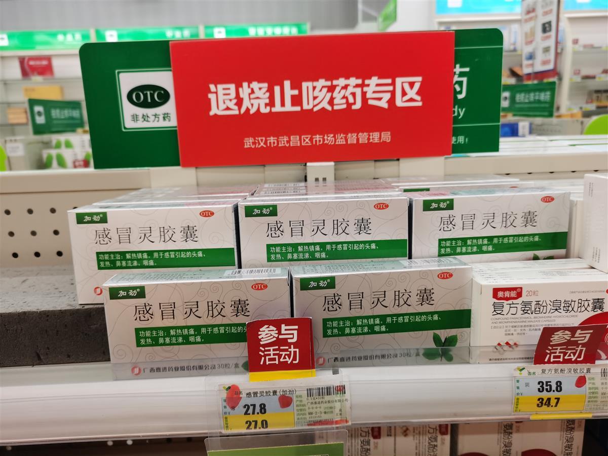 武汉市武昌区市场监管局在多家药店内设立了退烧止咳药专区红色标识,方便消费者购买和监督。专区内,除极少数紧俏的防疫药品缺货外,常见的感冒冲剂、退烧药、消炎药供应充足、价格平稳。例如,武昌区森林大药房所售的布洛芬缓释胶囊为27.3元每盒(24粒);友谊大道天寿大药房网售的999牌感冒灵颗粒为14.5元每盒,与平时价格相差无几。