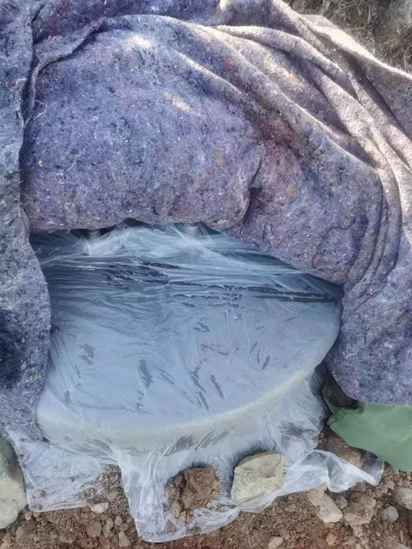 为保护电网铁塔塔基,防止被冻坏,该公司项目工人将水泥浇筑后的塔基用保温膜、棉毡、棉被层层包裹起来。