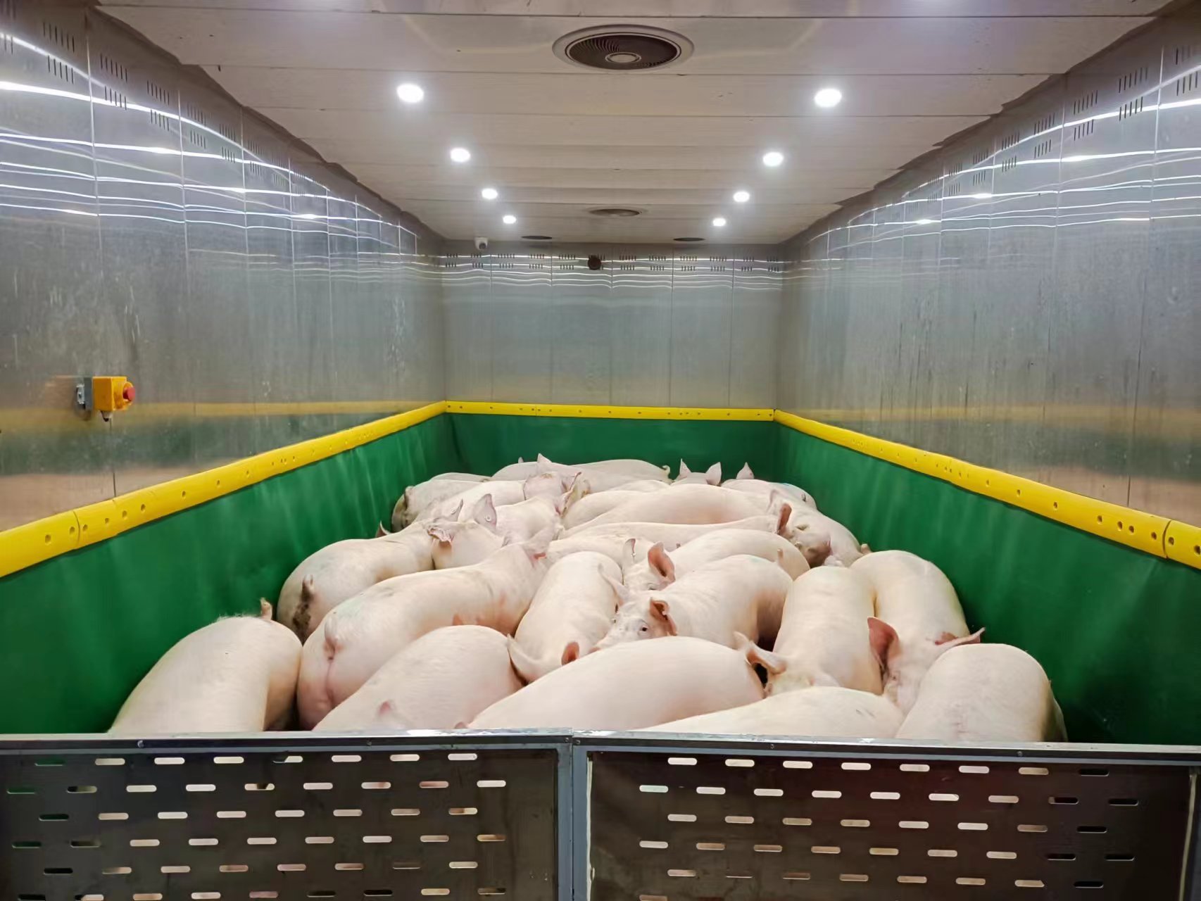 早上5点,三台全封闭空调运猪车到达洗消中心,开始给生猪进行洗消烘,早上7点,车辆到达出猪站区域再次消毒,运猪车司机及现场人员,在烘干间干烘10分钟后,接着洗澡,统一穿戴一次性防护服、口罩和鞋套,确保整个出猪过程安全、高效。7点30分,三台运猪车倒车至出猪站升降机,准备就绪。138头金猪乘坐专用电梯到达负一楼,电梯门打开,一头头金猪在工作人员的引导下走向出猪通道,最后由场内生安组人员将出猪通道的金猪赶至出猪站平台并把猪关进全封闭空调运猪车,场内人员与出猪站人员全程不交叉,确保生物安全。