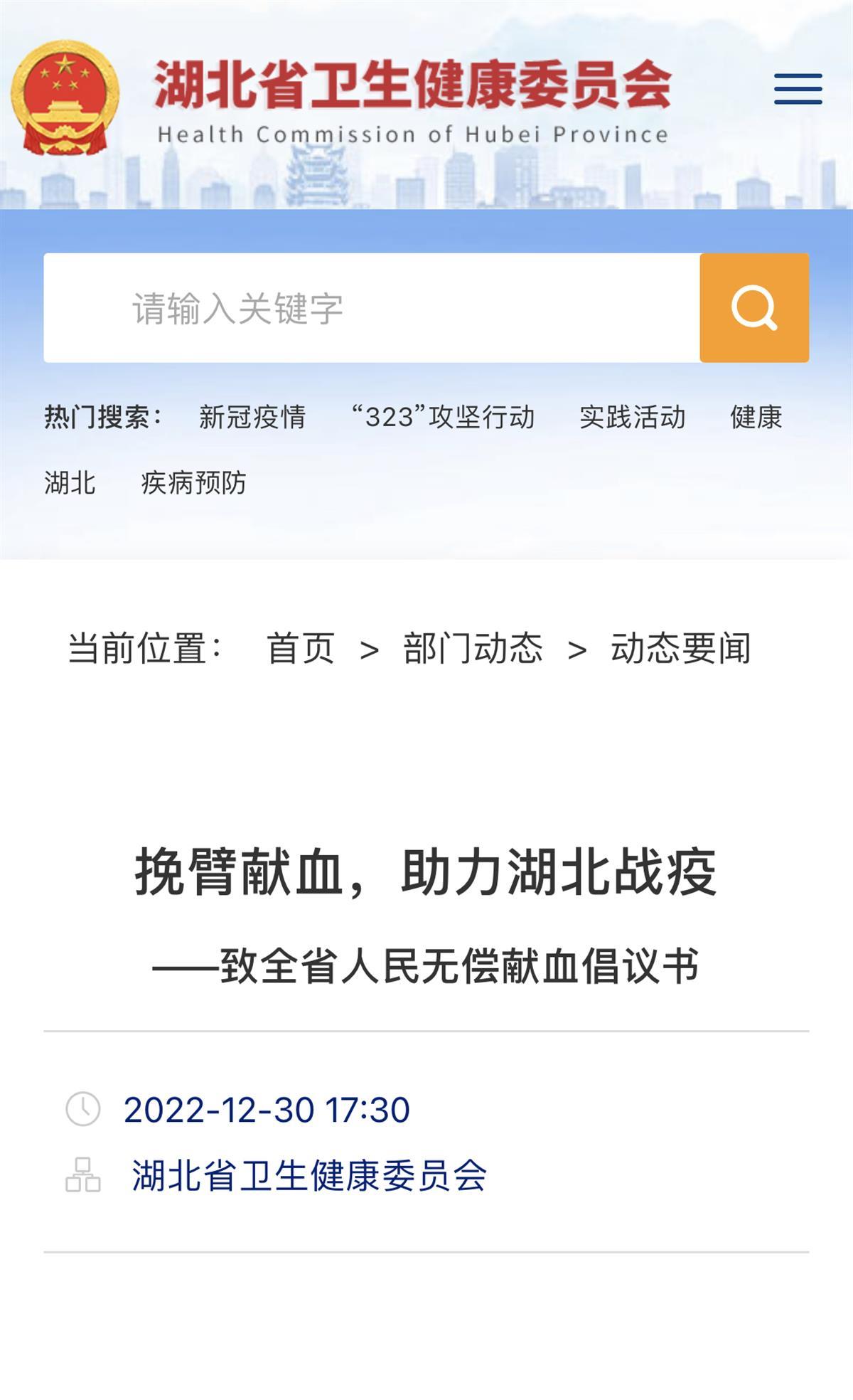 12月30日,湖北省卫健委在官网上发布《挽臂献血,助力湖北战疫——致全省人民无偿献血倡议书》,内容如下: