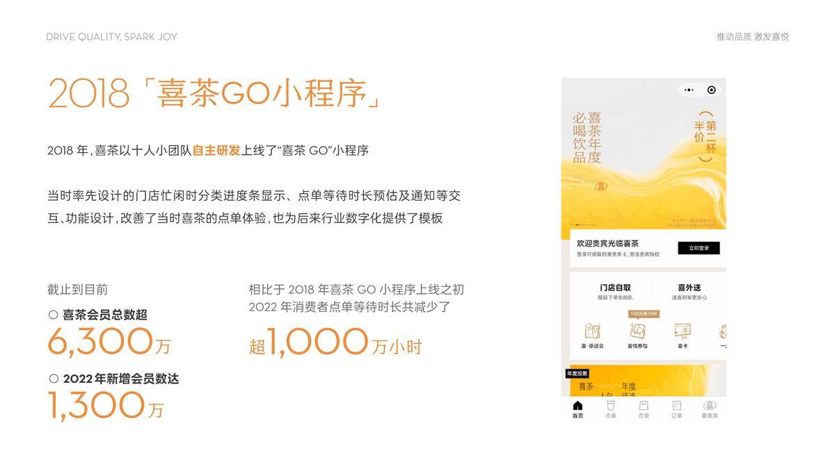 早在2018年6月,喜茶上线了以十人的小团队自主研发的“喜茶GO”小程序,其中的门店忙闲时分类进度条显示、点单等待时长预估及通知等交互、功能设计,切实地改善了当时喜茶的点单体验,改变了当时餐饮行业数字化工具多以APP为主、更多承担会员管理功能的现状,为行业数字化发展提供了模板。