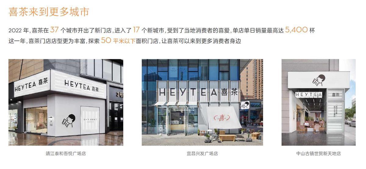 2022年,喜茶还进入了更多城市,服务了更多大众消费者。喜茶十周年报告披露数据显示,截至2022年底,喜茶已经进入了全球83个城市。2022年喜茶在37个城市开出新店,其中包括长春、哈尔滨、龙岩、临沂、襄阳、衢州等17个新城市首店,这些门店单店日销量最高达5,400杯。喜茶在这些城市保持着较高品牌势能,深受消费者喜爱。