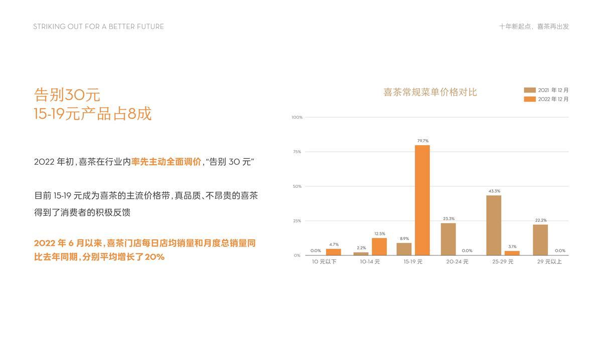 1月3日,喜茶发布了其品牌十周年报告。在这份题为《喜茶这十年》的报告中,喜茶披露了2022年部分经营数据,包括喜茶GO会员人数已经突破了6300万、2022年进入新城市后首店单日最高销量达5,400杯、2022年6月以来喜茶日店均销量和月度总销量同比去年分别平均增长20%……这些数据也向外界展示了喜茶作为新茶饮第一品牌,依靠产品和品牌优势,持续稳健增长。
