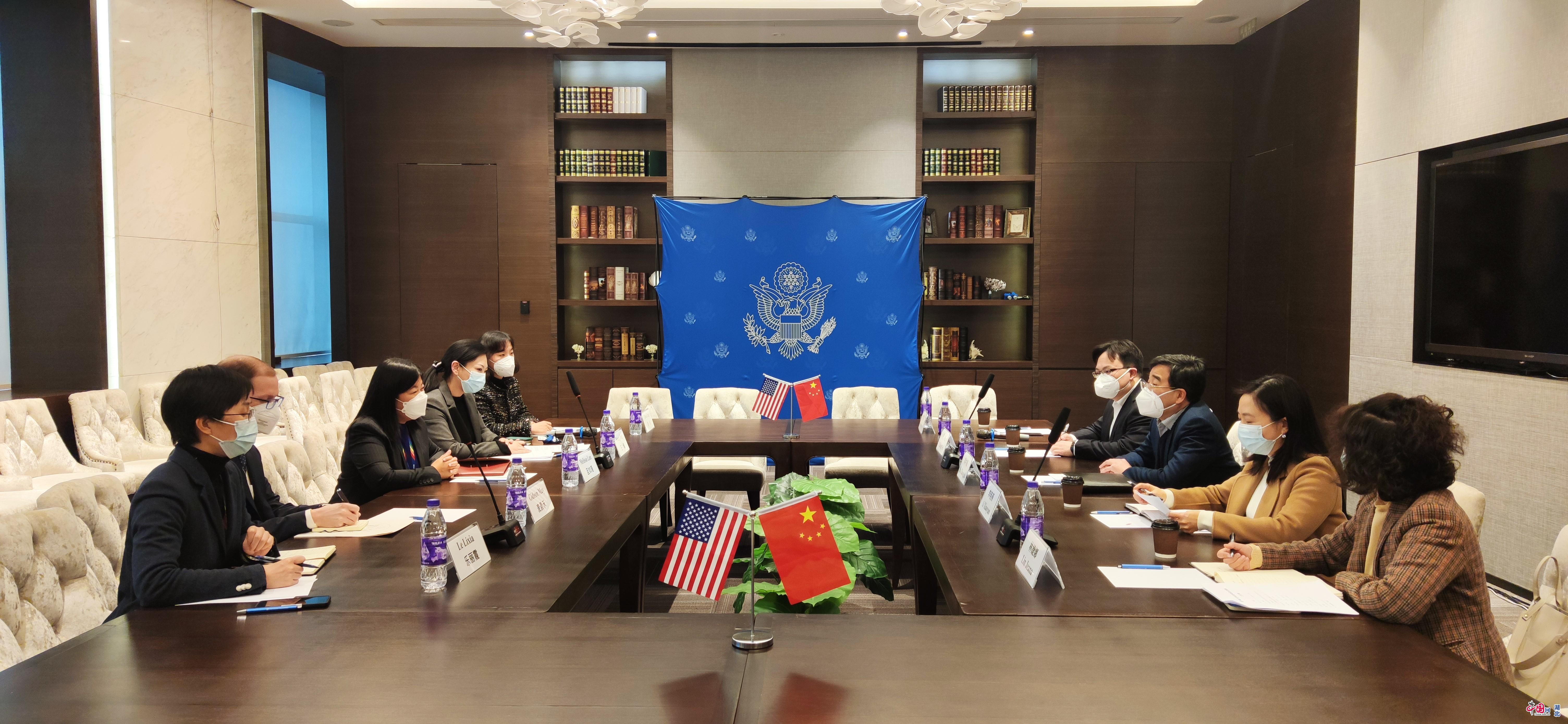 蓝如瑾总领事对胡中海主任一行表示欢迎,并对湖北省贸促会与总领馆长期保持愉快的合作表示赞赏。她介绍了今年计划实施的美国纯净美妆线上展演和脱碳政策线上研讨会等合作项目。