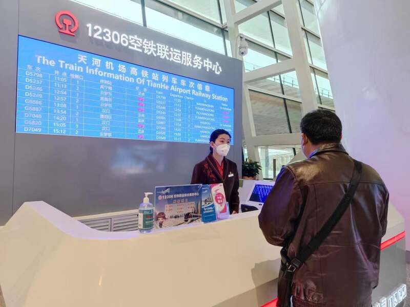 以往,旅客在机场换乘高铁,需要到机场高铁站售票窗口咨询购票,再继续旅行。现在,旅客在位于机场到达厅的12306空铁联运服务中心咨询购票后,就可以乘坐高铁继续旅行,大大节省了出行时间。