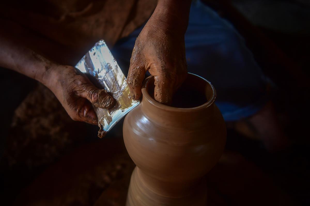 取土、盘泥、打型、拉坯、晾坯、上色……一件土陶器,要经过27道工序,方能成型。在胡光荣40岁以前,平均3分钟就能做好一把土陶壶的壶身。10天一个周期,一窑土陶器要烧6到10小时,800摄氏度以上的窑温,火候全凭经验把控,胡光荣烧的一窑土陶器,“成活率”高达90%。