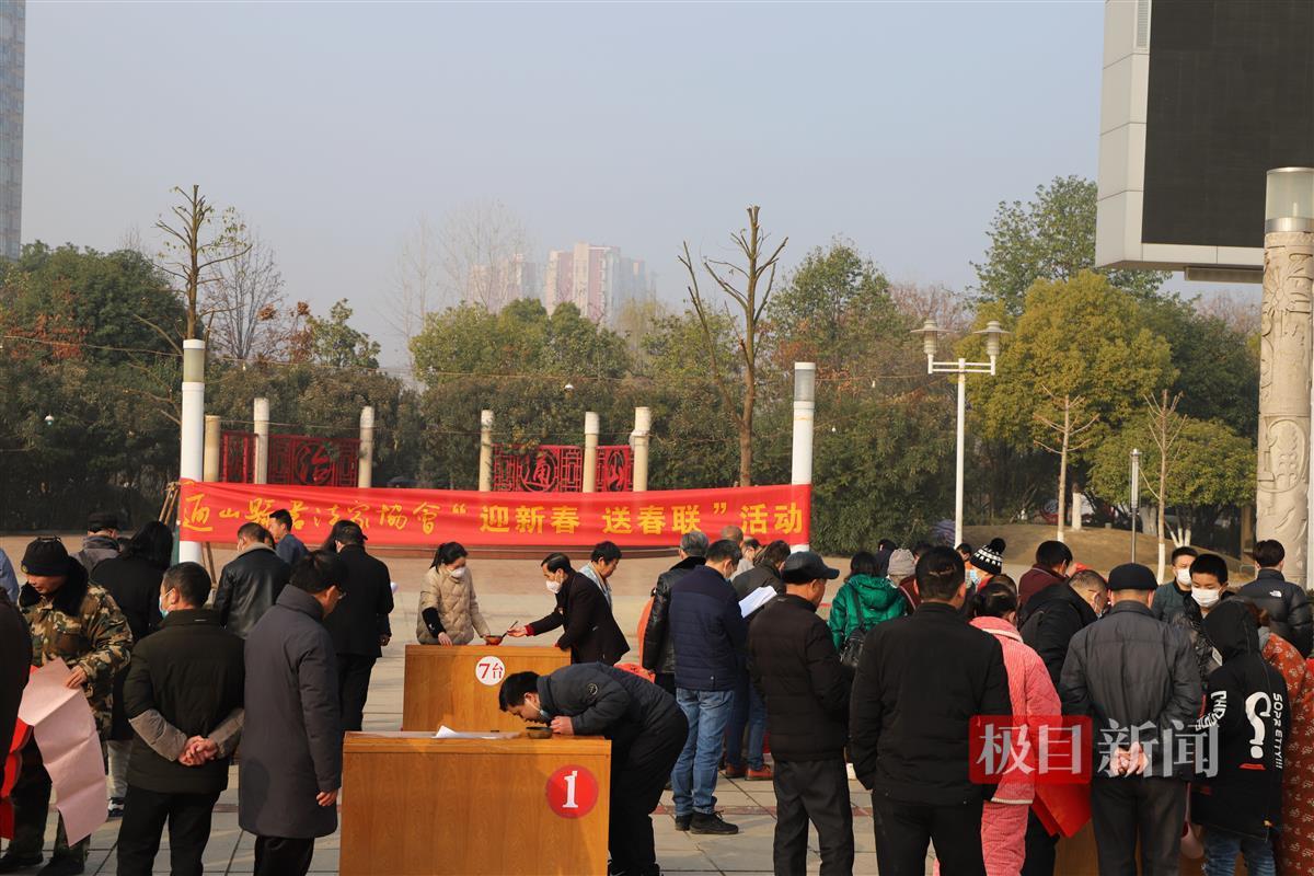 1月11日上午,湖北通山墨香满溢、喜气盈盈。县政府广场上,该县书法家协会组织20多位书法家,现场书写春联免费赠送市民,以笔寄意、以字传情,把美好愿望写进春联,用春联为大家送去新春的问候。