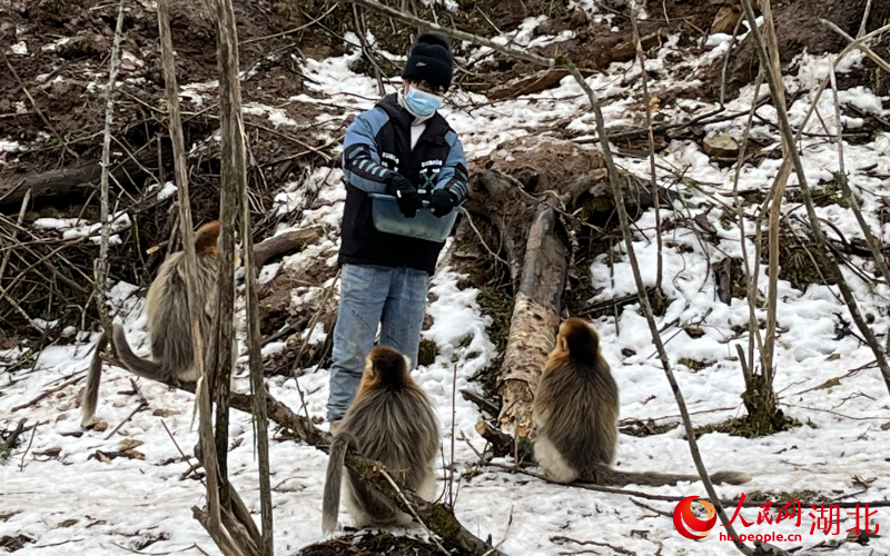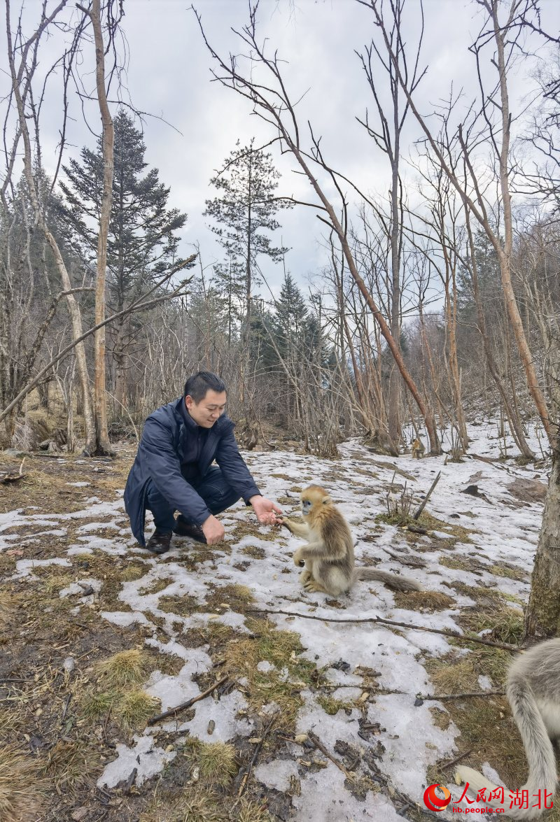 黄天鹏介绍,冬季金丝猴的食物缺乏,我们需要每天给他们投递一些食物。“它们喜欢吃花生米、橙子、苹果,只要让猴群听到花生米撞击发出的响声,它们就会下山。只要我们走近,猴群还会上前和我们打招呼,握手互动,就像好朋友一样。”