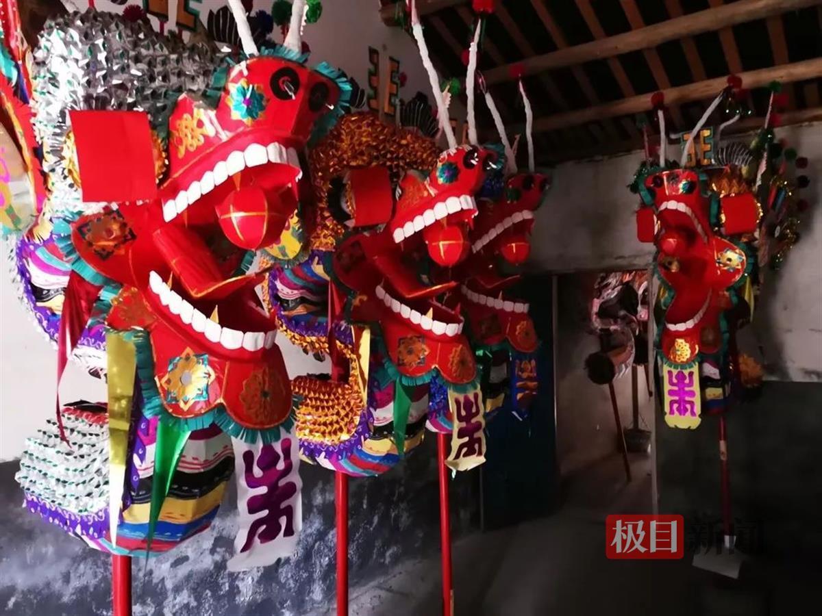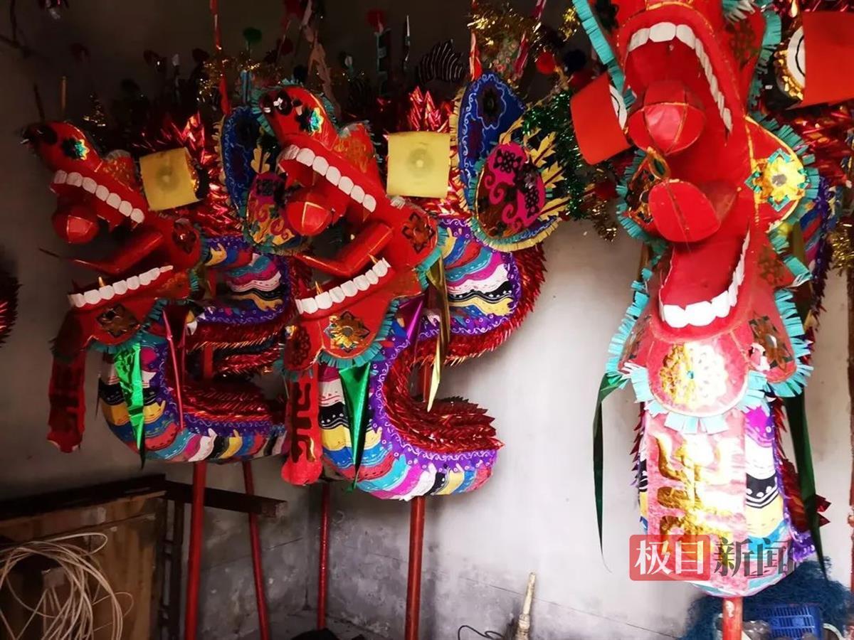 在程武华家中,几十条已经扎好的龙灯、狮子头、排灯、彩莲船堆满了整个房间,栩栩如生,十分喜气。春节前,程武华扎制了30多条龙灯,他说今年还好,不算太忙,订单最多的是2019年,那年扎了近40条龙灯。“是从业以来扎得最多的一年。”