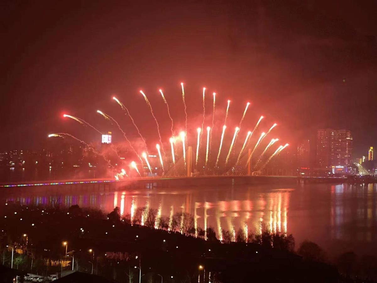 在城东新区一号桥,烟花直指夜空,似金沙喷射而出,绚丽的烟花将夜空装点得流光溢彩、美不胜收,人们走出家门,欣赏焰火,感受喜庆的节日气氛。