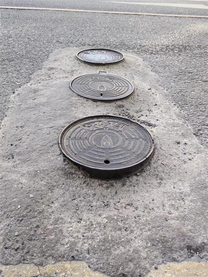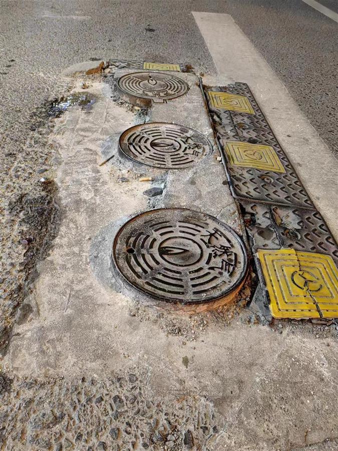 1月30日,记者在廖女士的指引下来到现场。据观察,这些凸出的井盖都是三个一组,在路面中央一字排开,走近一看,上面印着“天然气”三个字。这些井盖的周围明显有水泥围拢,可是不少水泥部分已经干裂损坏,造成这些井盖凸出于地面。而像这样的井盖在附近近百米道路上约有四组,每组三个一排。