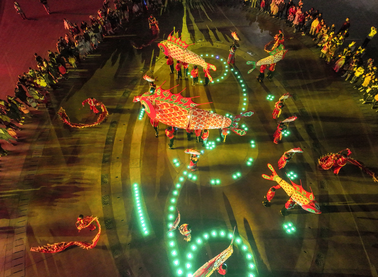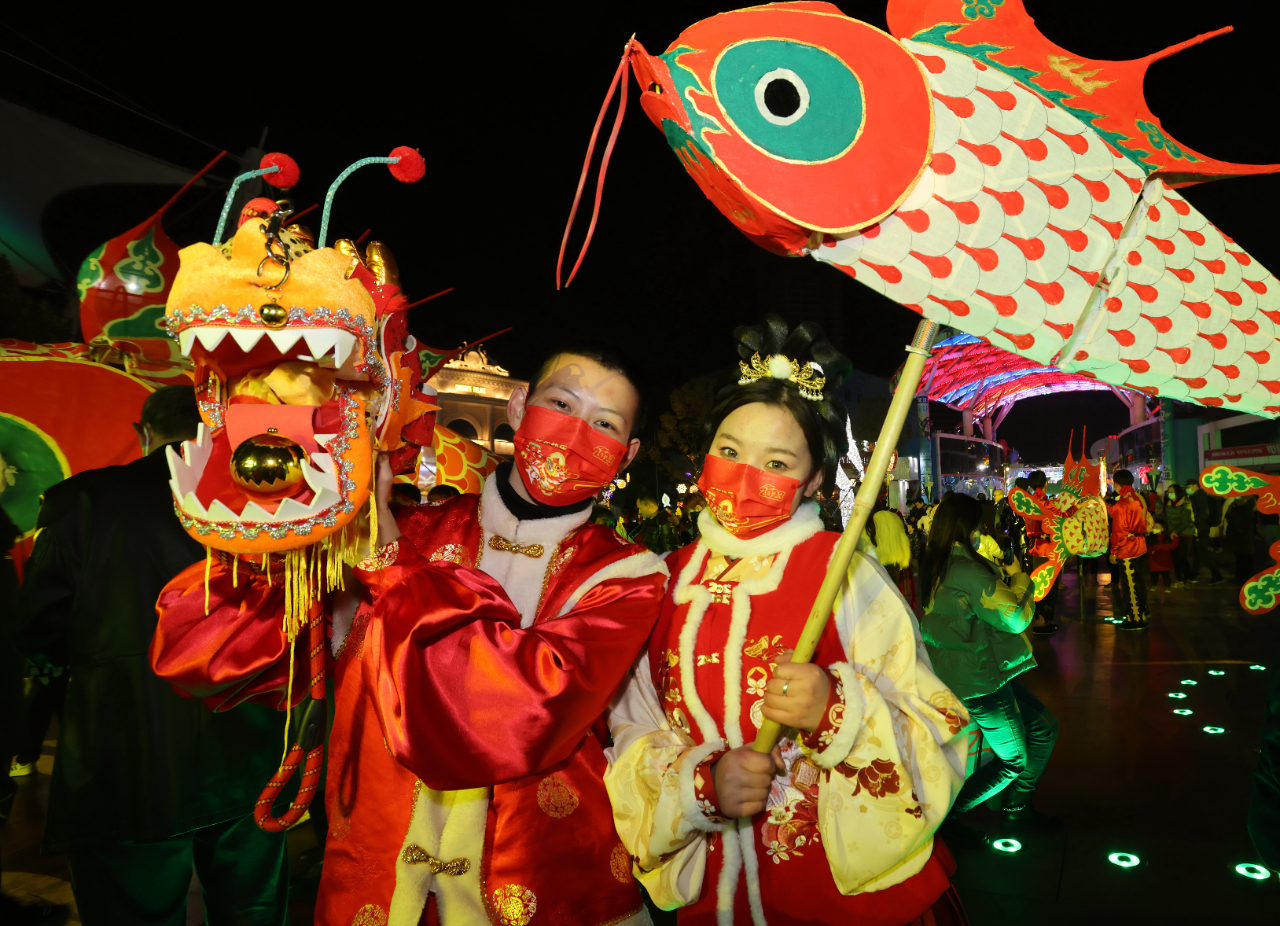 徽州传统“汪满田鱼灯”1月31日在湖北武汉欢乐谷园区点亮,营造喜迎元宵佳节的热烈气氛。