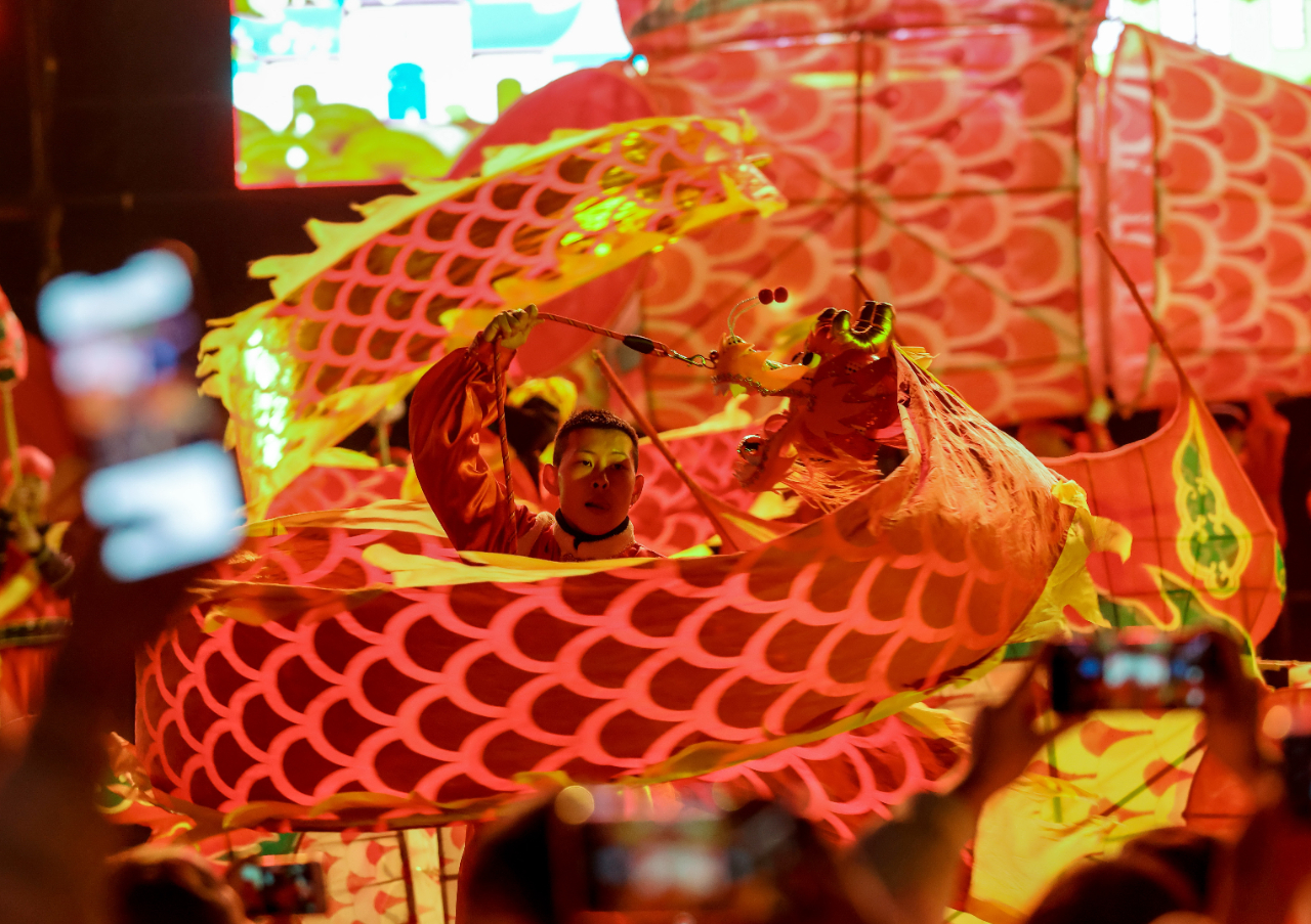伴着“汪满田鱼灯”的锣、鼓、锵声,绘着七彩图案鱼灯在园区巡游,吸引众多游客前来观赏。