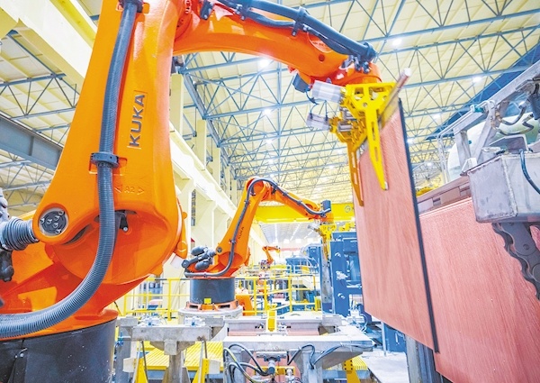 2月2日,黄石新港园区,大冶有色弘盛铜业自动化产线上,机械臂忙碌挥舞。弘盛铜业是目前国内产能最大的铜冶炼厂。今年元月份,该公司阴极铜产量1.05万吨、阳极板产量2.6万吨,产值达10亿元。目前,公司投料量节节攀升,冲刺全年实现生产阴极铜34万吨,工业产值240亿元。