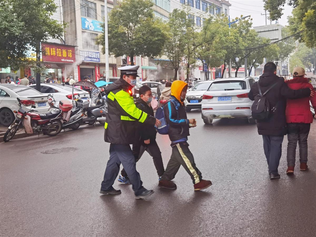 “小朋友们,过马路不要追逐嬉闹,要注意过往车辆。”2月7日早上,湖北黄冈浠水县公安局交警大队秩序一中队民警吴响在学堂路口一边指挥交通,一边叮嘱过马路的学生们。