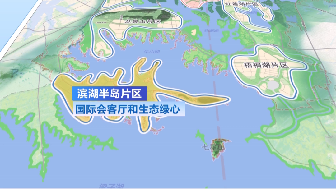 滨湖半岛片区打造国际会客厅和生态绿心,相当于新城的“生态客厅”;