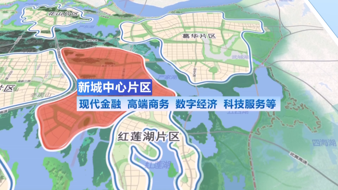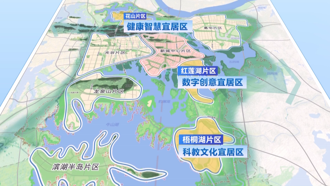 红莲湖片区、花山片区、梧桐湖片区则分别打造数字创意、健康智慧、科教文化宜居区,这是未来新城的居住区。在这里,将实现人类与自然和谐、产业与产业共生、生产与生活协调。