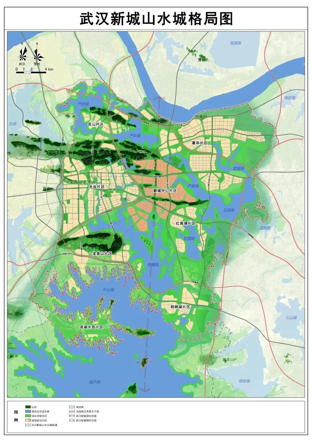 根据《规划》,武汉新城由以左岭为主的新城中心片区,以及光谷片区、葛华片区、花山片区、龙泉山片区、红莲湖片区、梧桐湖片区、滨湖半岛片区共8个片区组成。