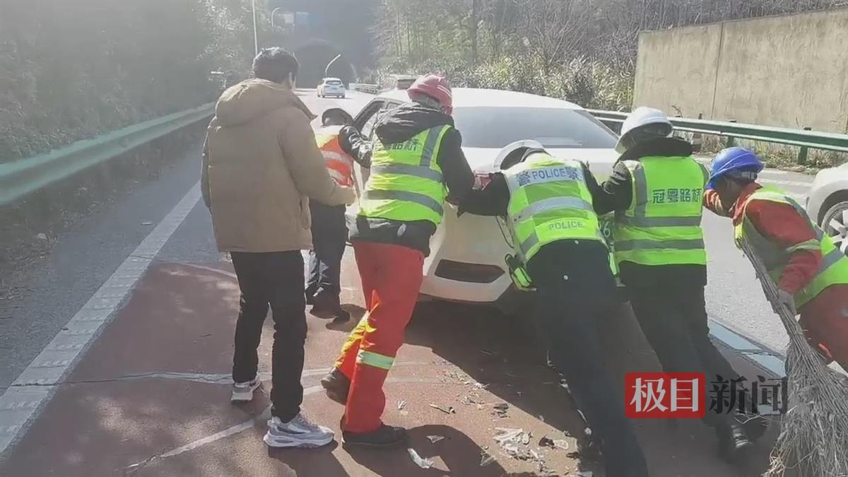 春运期间,交警和路政部门帮助抛锚车辆推下高速(高警总队二支队供图)