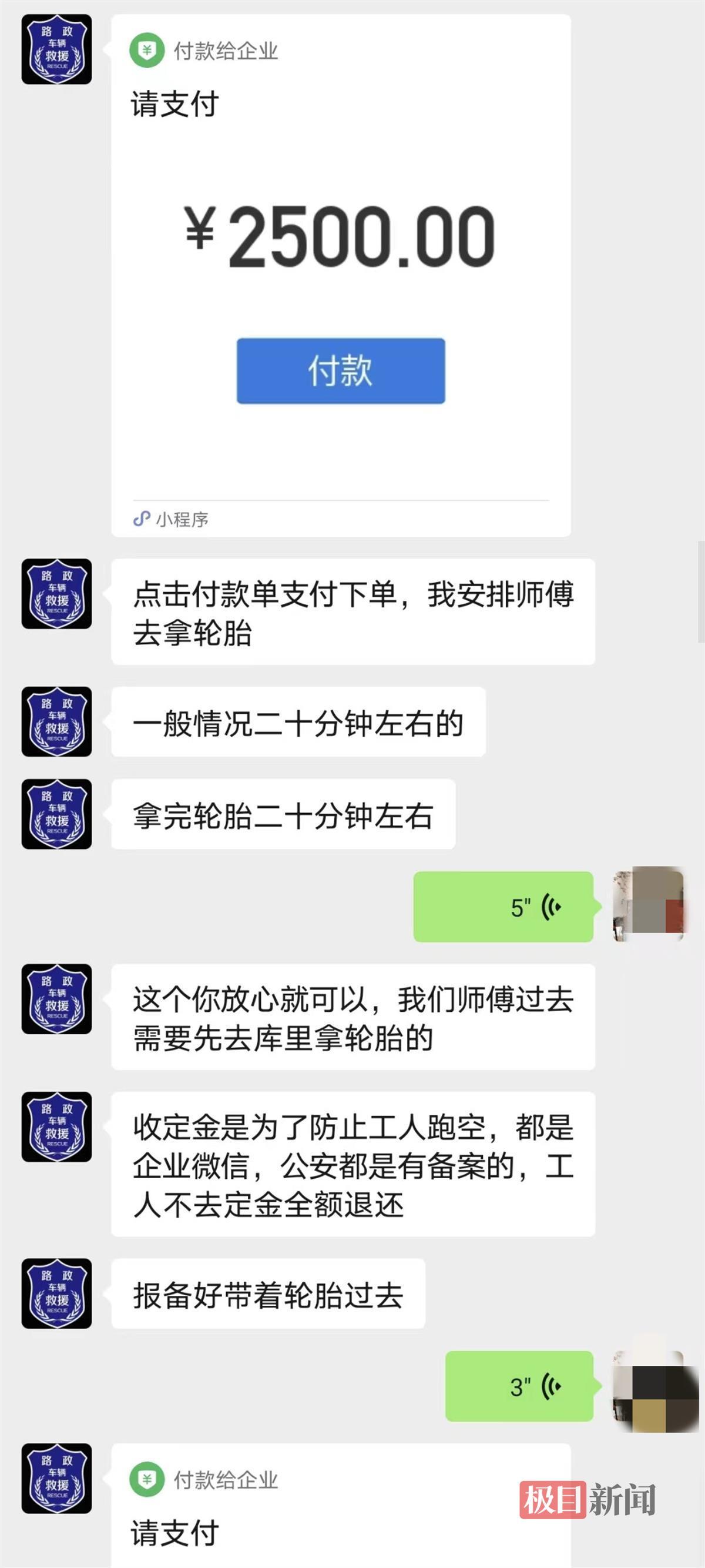 担心上当受骗,李先生留了个心眼,要求换好了轮胎后再一次性支付。“收定金是为了防止工人跑空,都是企业微信,公安部门有备案,工人不去定金全额退还。”对方解释说,高速公路属于承包管制路段,为保证安全,不允许长时间在路上停车。经过一番讨价还价,最终李先生先后支付了“救援定金”。