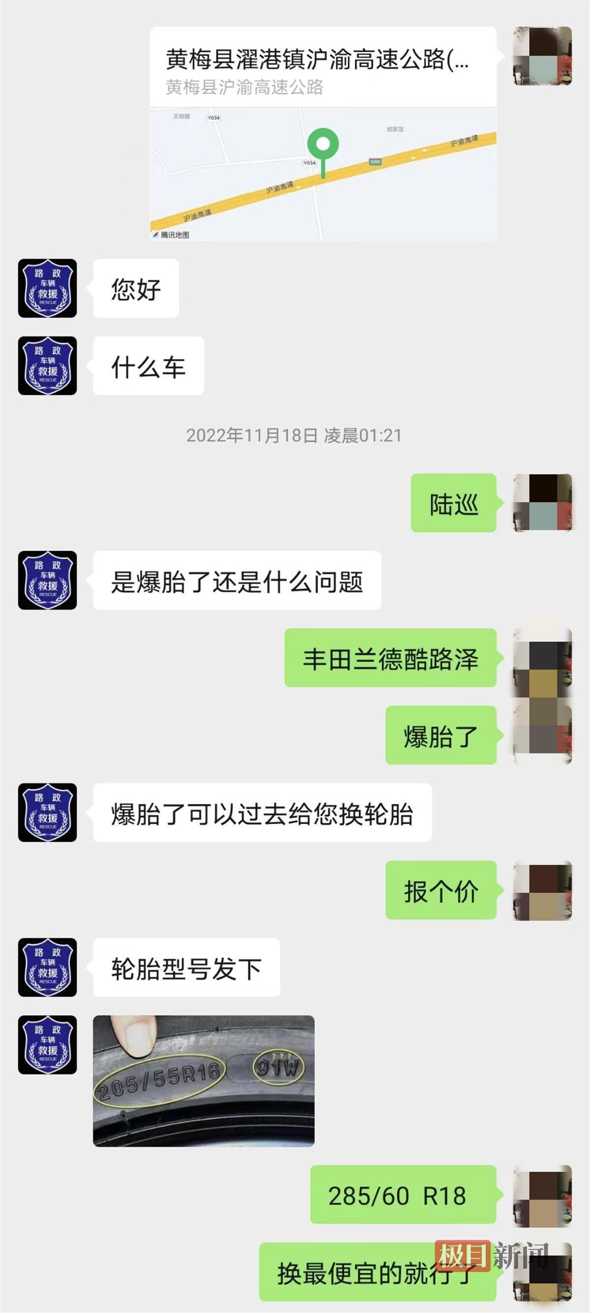 “微信头像是一个路政车辆救援的标识,开口讲得很专业。”李先生告诉极目新闻记者,对方表示可以安排人员过去换轮胎,在让李先生报了车辆型号和轮胎型号后,发来一个微信付款小程序,要求支付2500元钱才能安排人员到现场换胎。