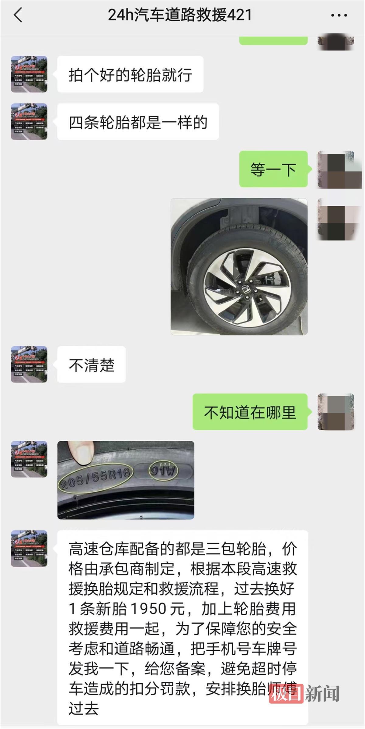 当记者将车辆和轮胎型号都拍照后,对方发来信息表示:“高速仓库配备的都是三包轮胎,价格由承包商制定,根据本段高速救援换胎规定和救援流程,过去换好一条新胎1950元(加上轮胎费用救援费用一起),为了保障您的安全考虑和道路畅通,把手机号车牌号发我一下,给您备案,避免超时停车造成的扣分罚款……”