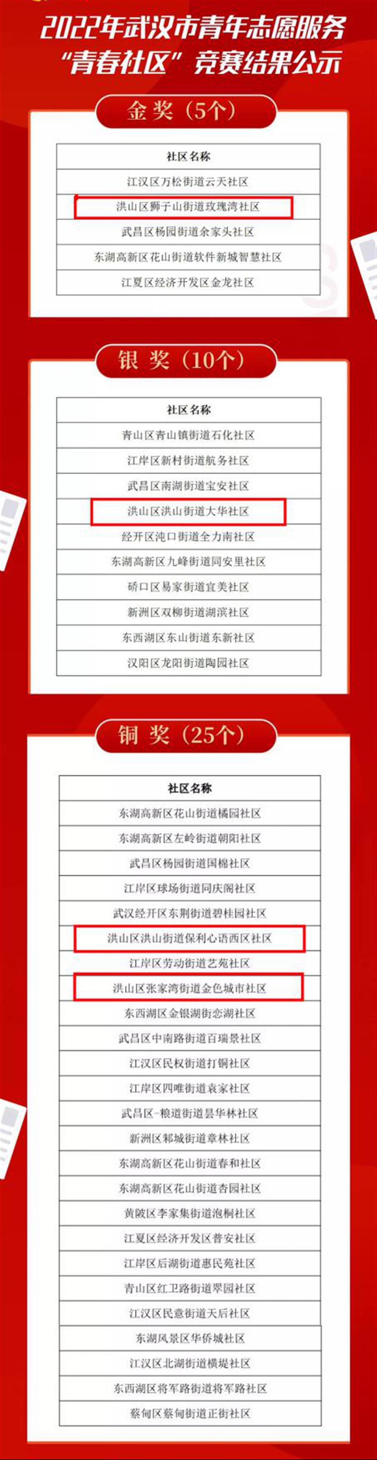 据悉,“青春社区”大赛从全市报名参与的187个社区项目中评选出金奖5个、银奖10个、铜奖25个。其中,洪山区狮子山街玫瑰湾社区获得金奖,洪山街大华社区获得银奖,张家湾街万科金色城市社区、洪山街保利心语西区社区获得铜奖。